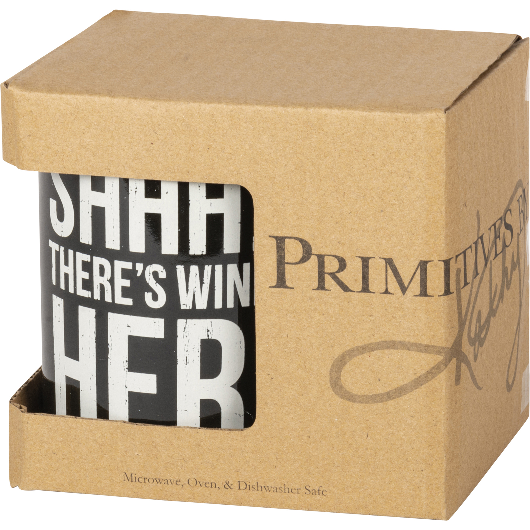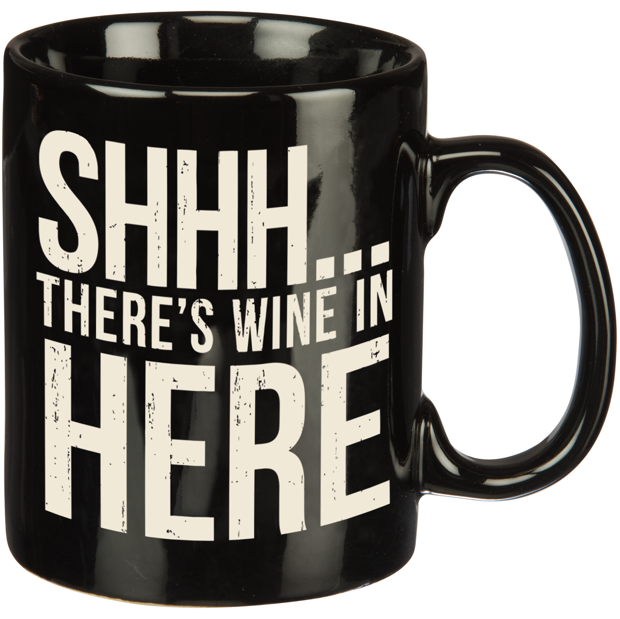 A black and white stoneware coffee mug lending a double-sided and distressed "Shhh… There's Wine In Here" sentiment. Microwave, oven, dishwasher, and food safe. Holds 20 oz.
