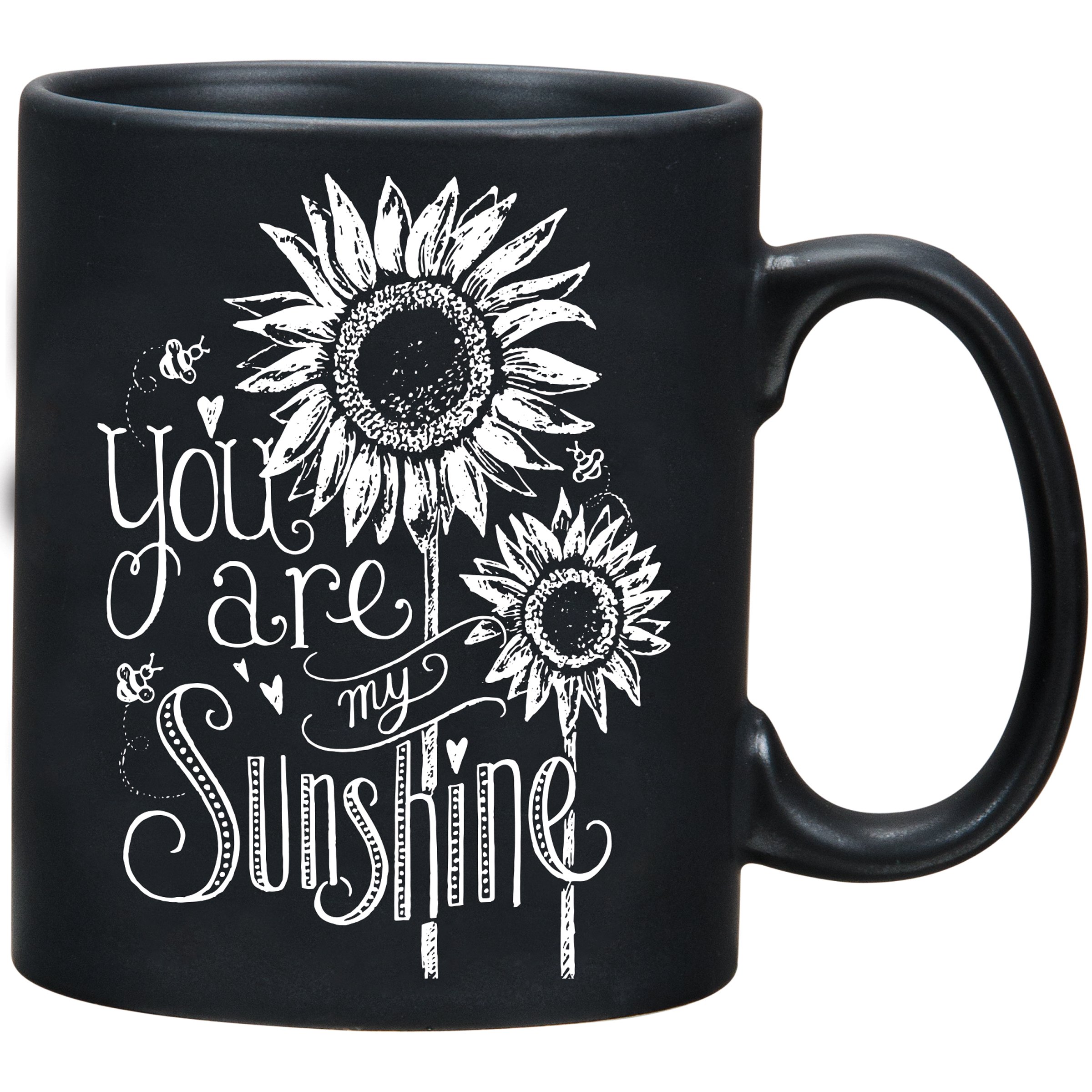 A stoneware coffee mug lending chalk art sunflower designs and "You Are My Sunshine" sentiment. Microwave, oven, dishwasher, and food safe. Holds 20 oz.
