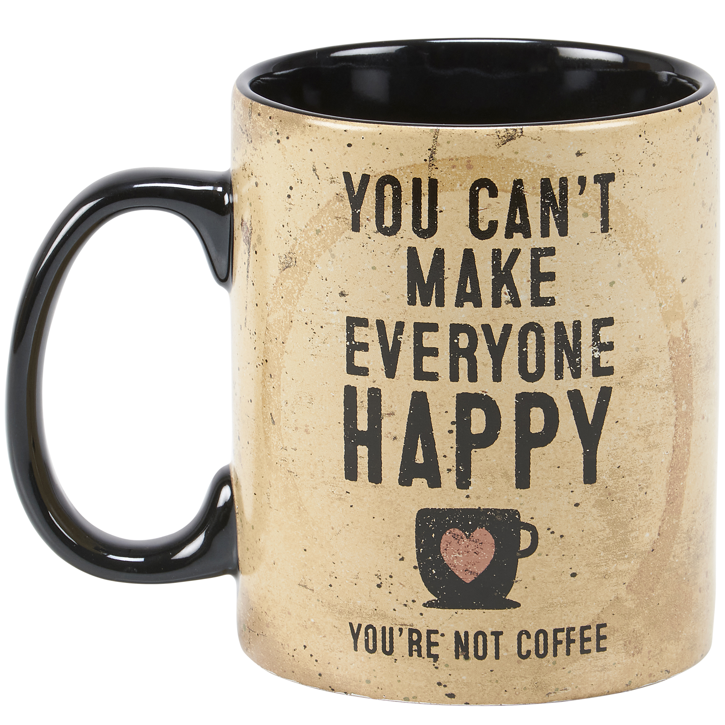 A stoneware 20 oz mug from our Tea & Coffee Collection displaying a double-sided design of coffee cup with a heart in a rustic style. Design also features a fun coffee-themed sentiment that reads "You Can't Make Everyone Happy - You're Not Coffee." Our You're Not Coffee mug is microwave, oven, dishwasher, and food safe for convenient use. A fun coffee-themed gift perfect for everyday drinkware.