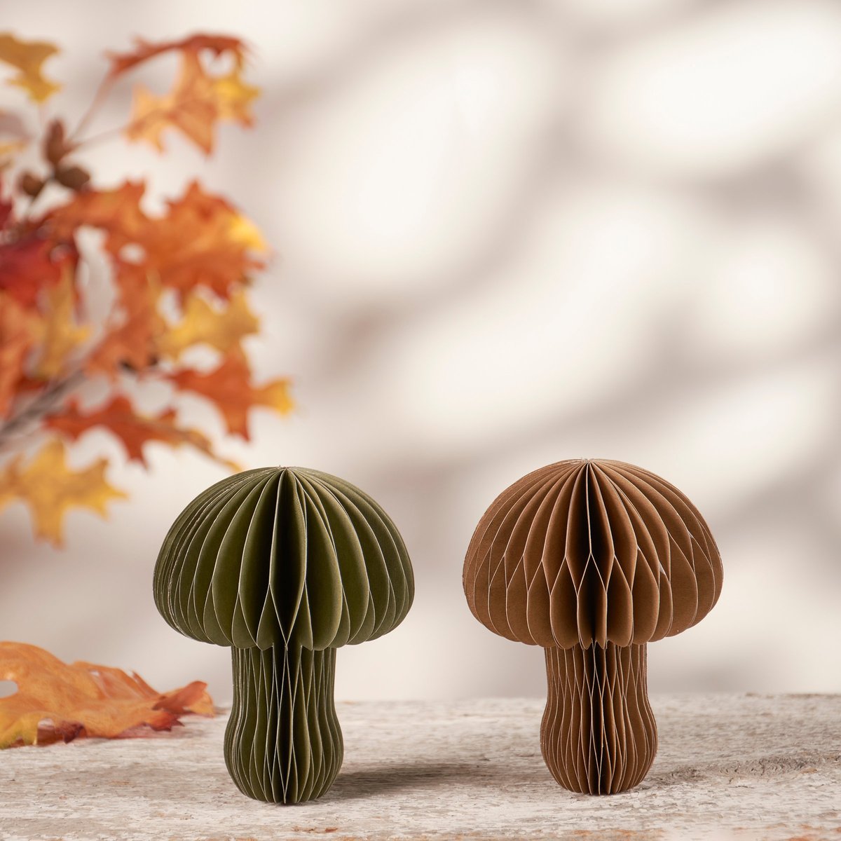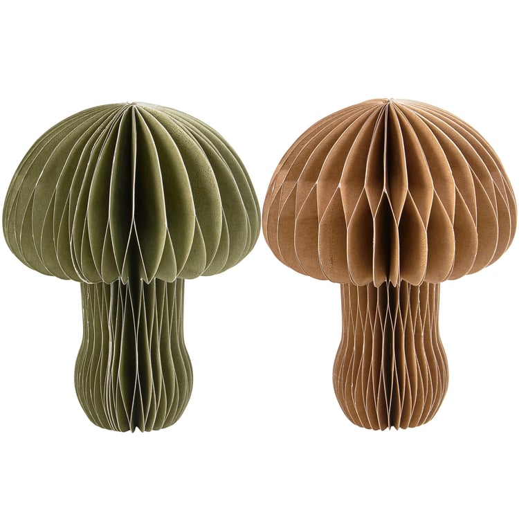 A set of paper honeycomb décor pieces from our Cottagecore Collection including a brown and a green mushroom in a folded paper design. Our Paper Honeycomb Mushroom set is designed to free-stand on flat surface for easy display. To display mushrooms, unfold and attach ends via magnetic closure. Seasonal paper mushrooms fold up flat when not in use for compact storage. A charming set of mushroom-themed home accents perfect for any room or for event decorations.