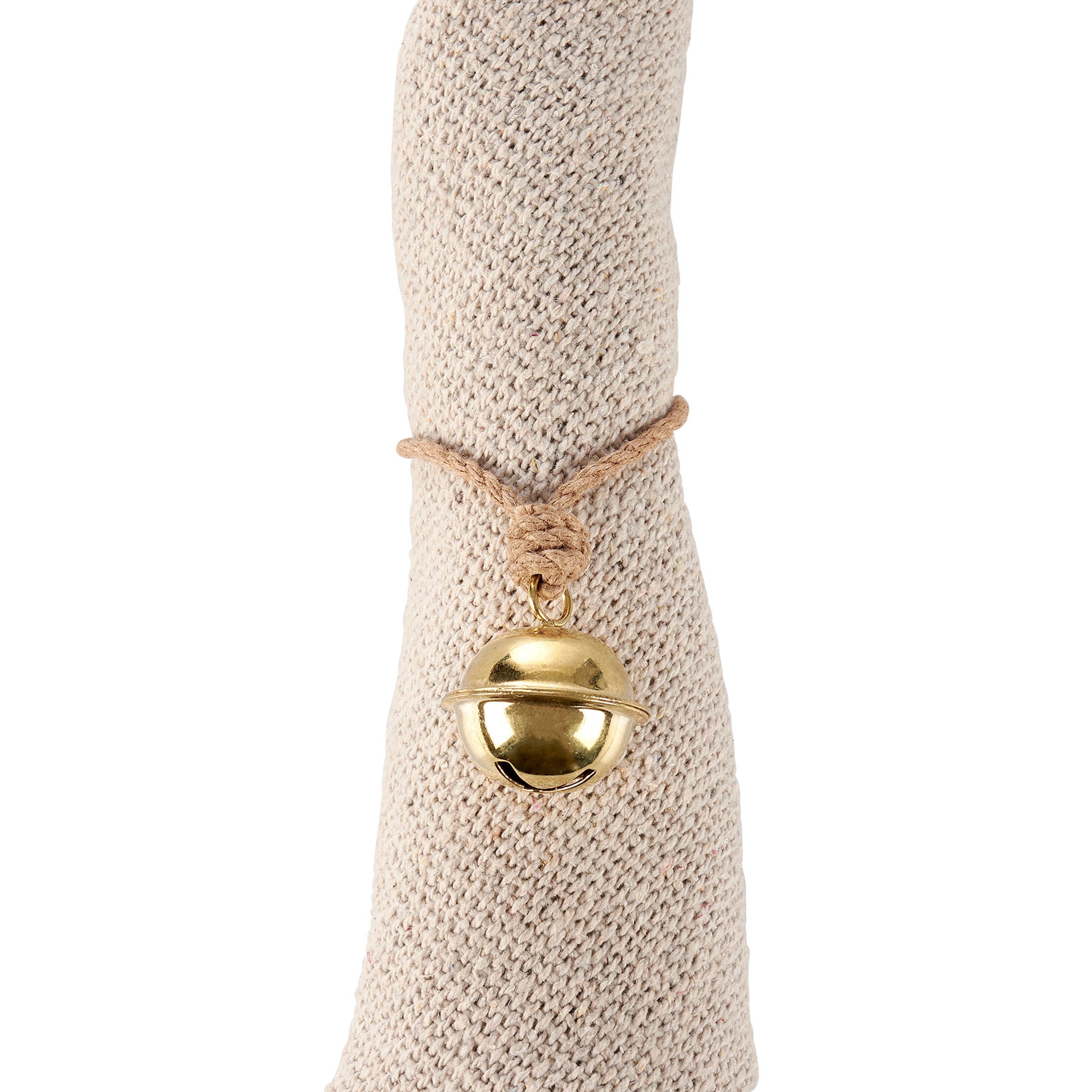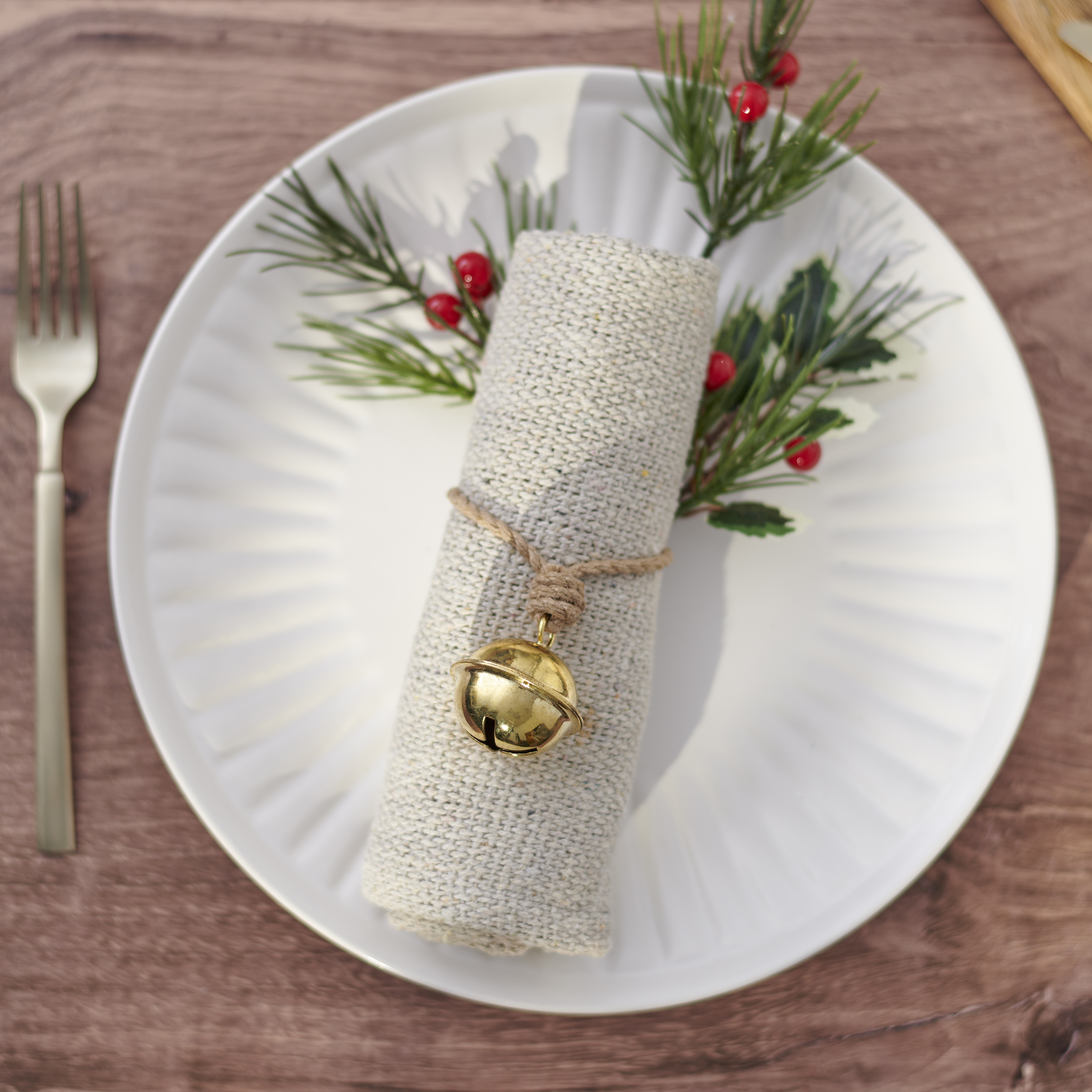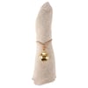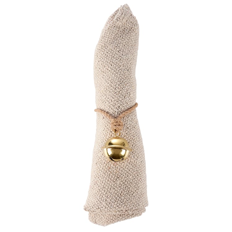 A napkin ring from our Christmas Collection featuring a gold bell design. Our Bell napkin ring includes attached jute loop to easily slip over rolled napkin and can be added to table setting when not in use as a seasonal accent. Napkin pictured not included. A rustic tabletop accessory perfect for seasonal gatherings.