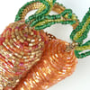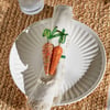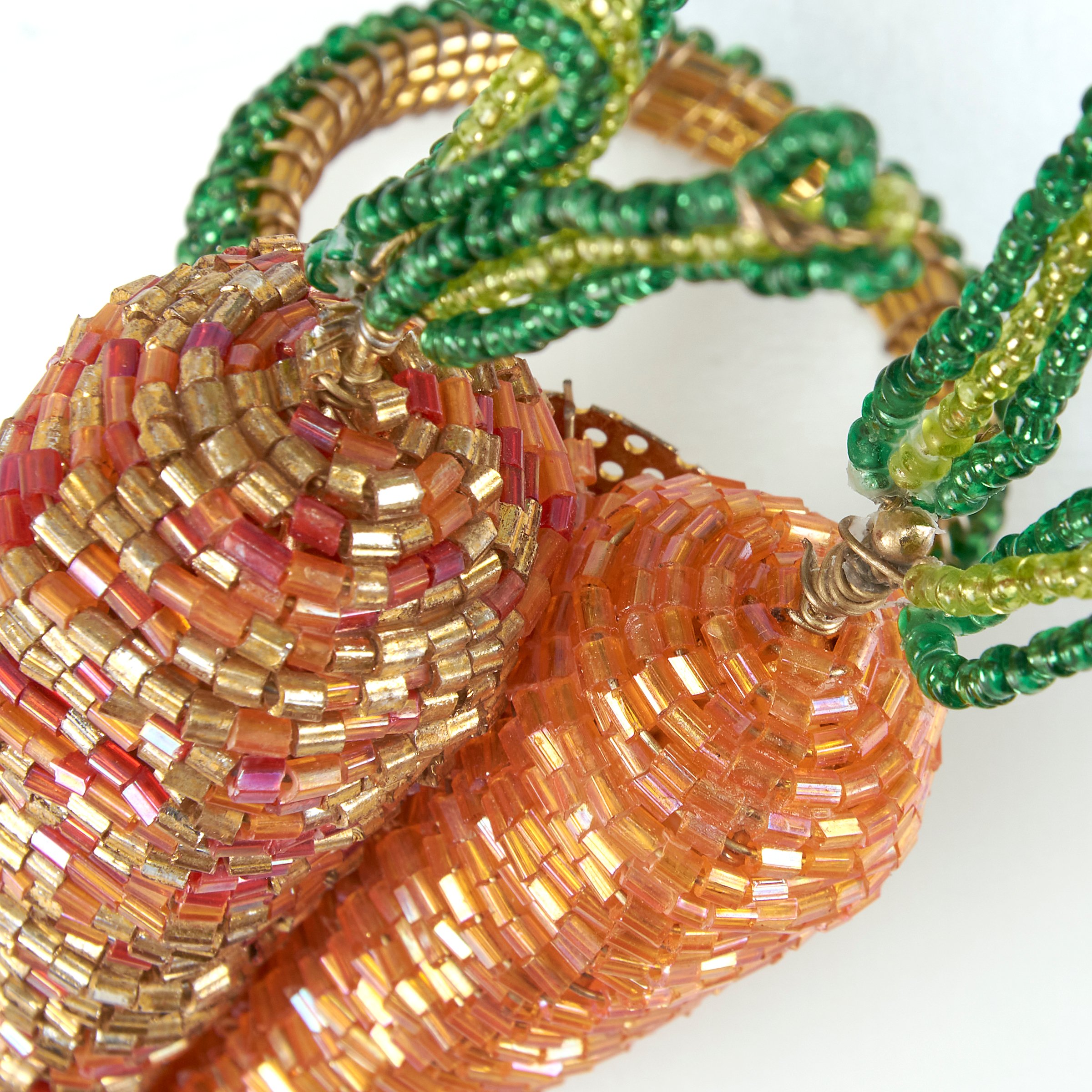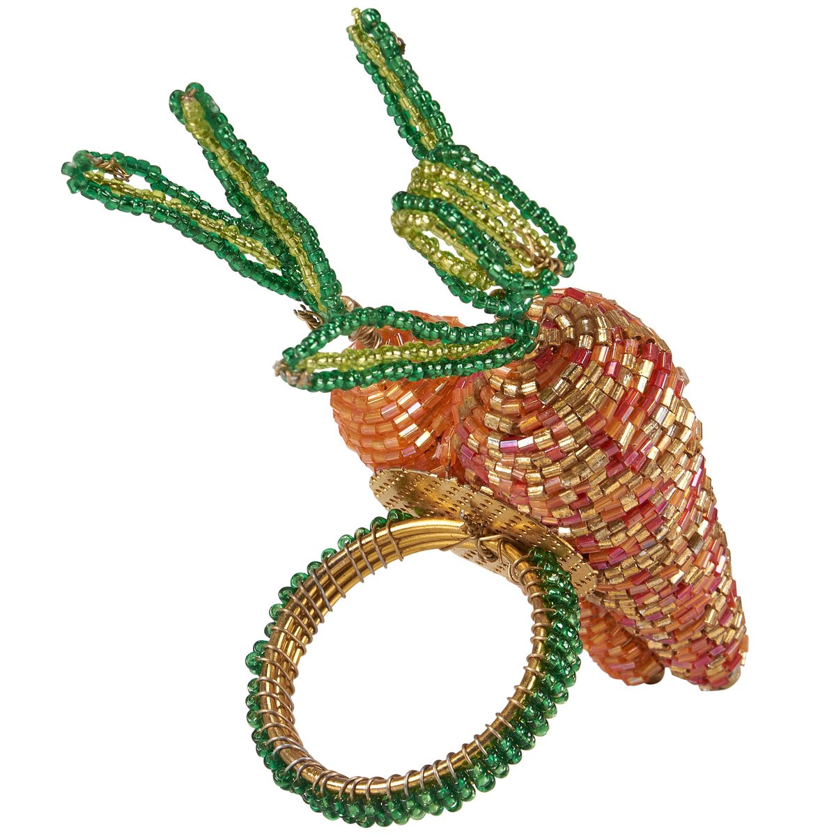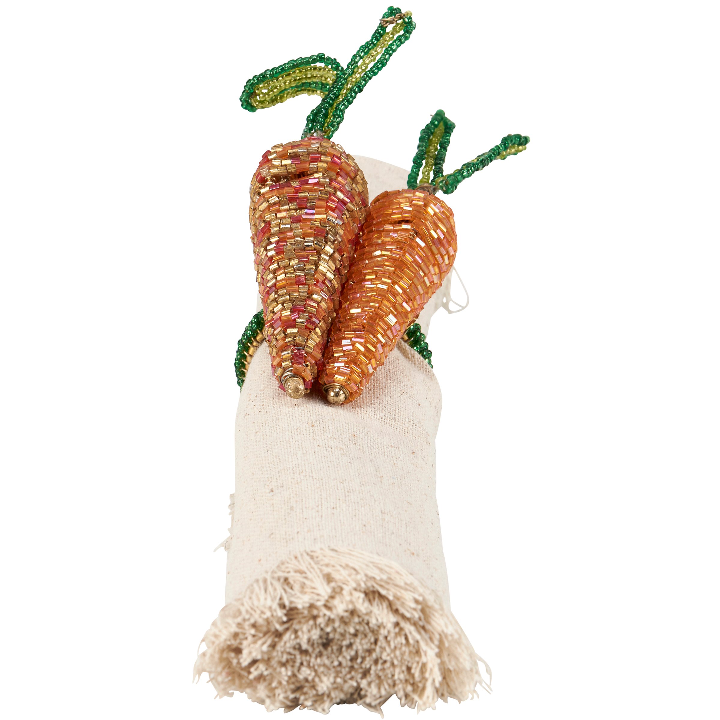 A decorative napkin ring from our Easter & Spring Collection featuring a craft style design of a couple carrots made with colored beads. Our Carrots napkin ring includes a metal ring to easily slip over rolled napkin and, when not in use, can be added to table setting as a seasonal accent. Napkin pictured not included. A charming tabletop accessory perfect for seasonal gatherings.