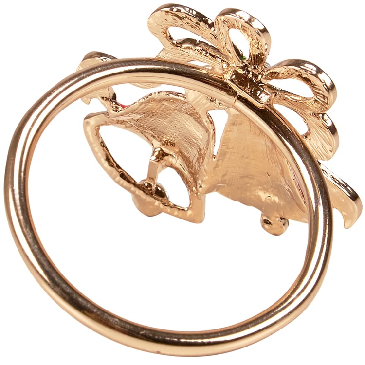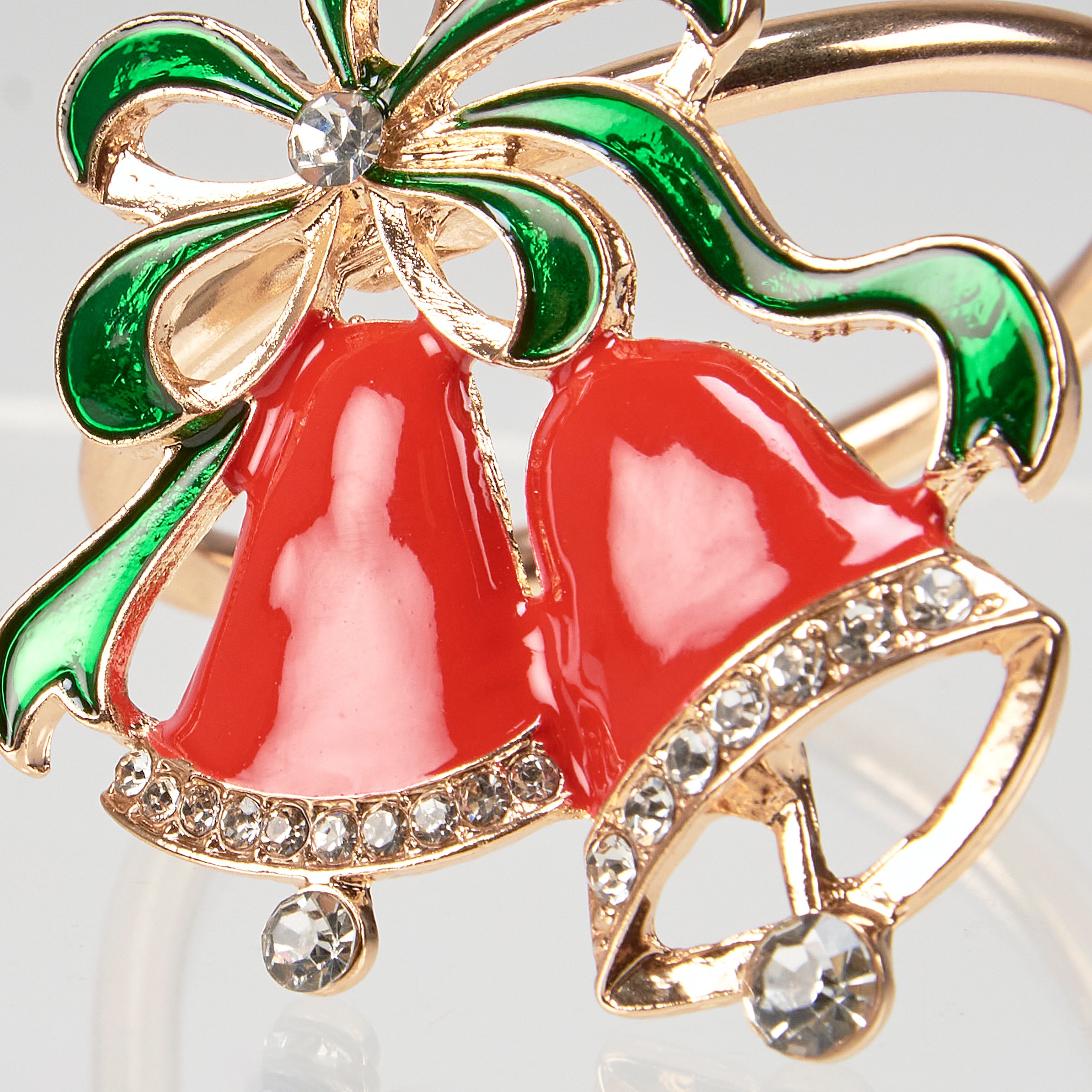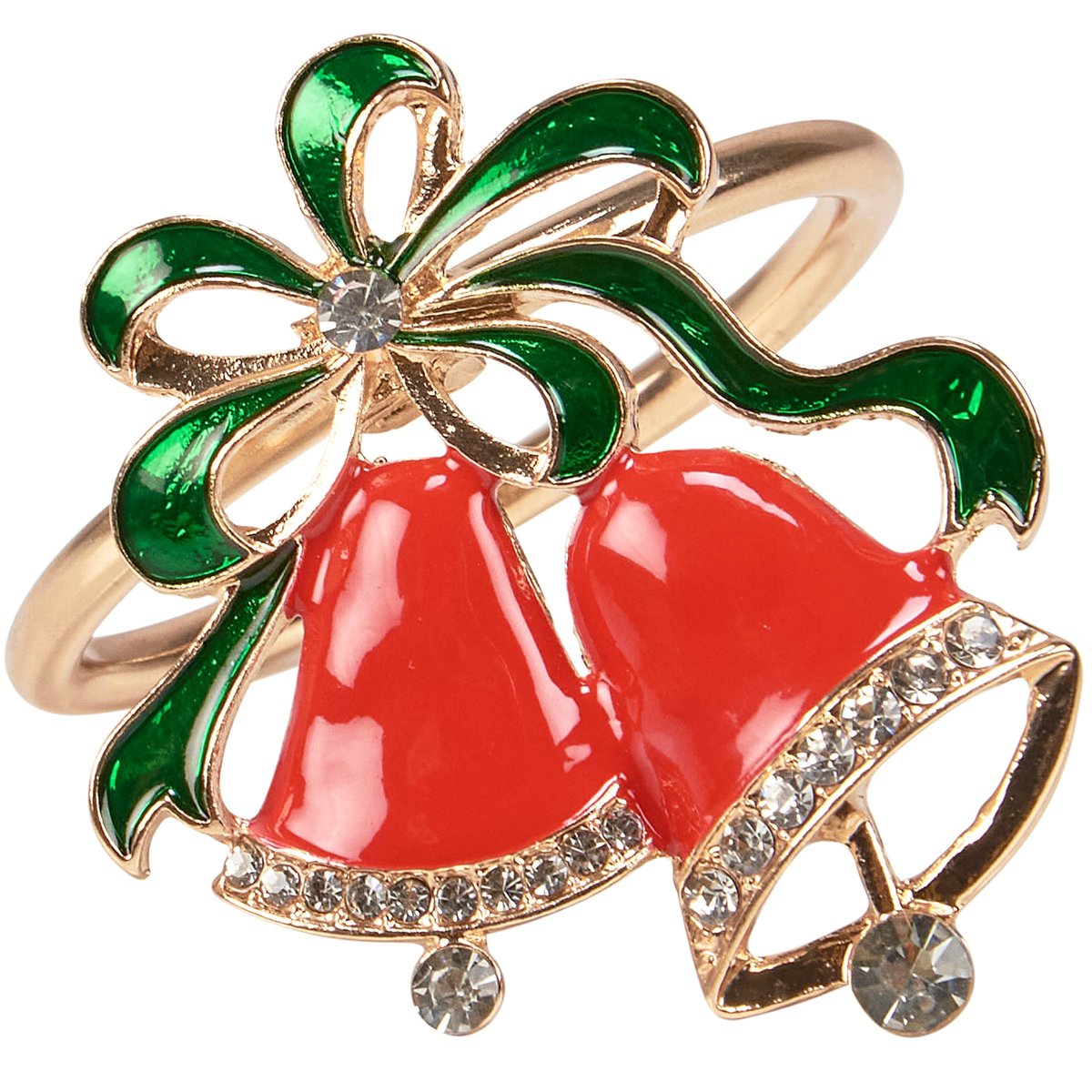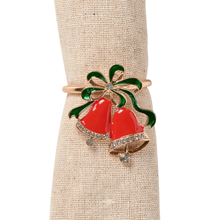 A metal napkin ring from our Christmas Collection featuring an elegant design of Christmas bells with diamond accents. Our Christmas Bells napkin ring includes attached metal ring that easily slips over rolled napkin, hen not in use, can be added to table setting as table décor. Napkin pictured not included. A vintage tabletop accessory perfect for seasonal gatherings.