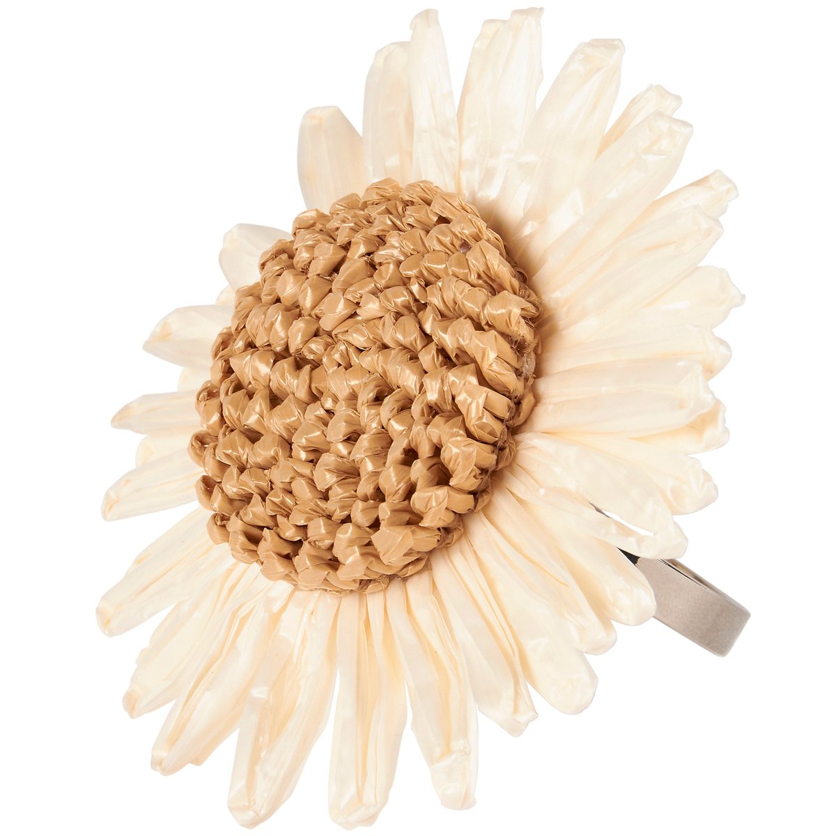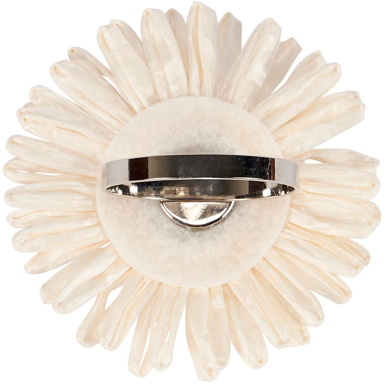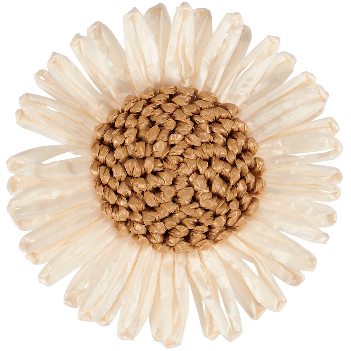 A decorative napkin ring from our Garden Collection featuring a craft style design of a daisy head made with woven raffia. Our Daisy napkin ring includes a metal ring to easily slip over rolled napkin and, when not in use, can be added to table setting as table décor. Napkin pictured not included. A charming tabletop accessory perfect for spring-themed tablescapes.