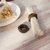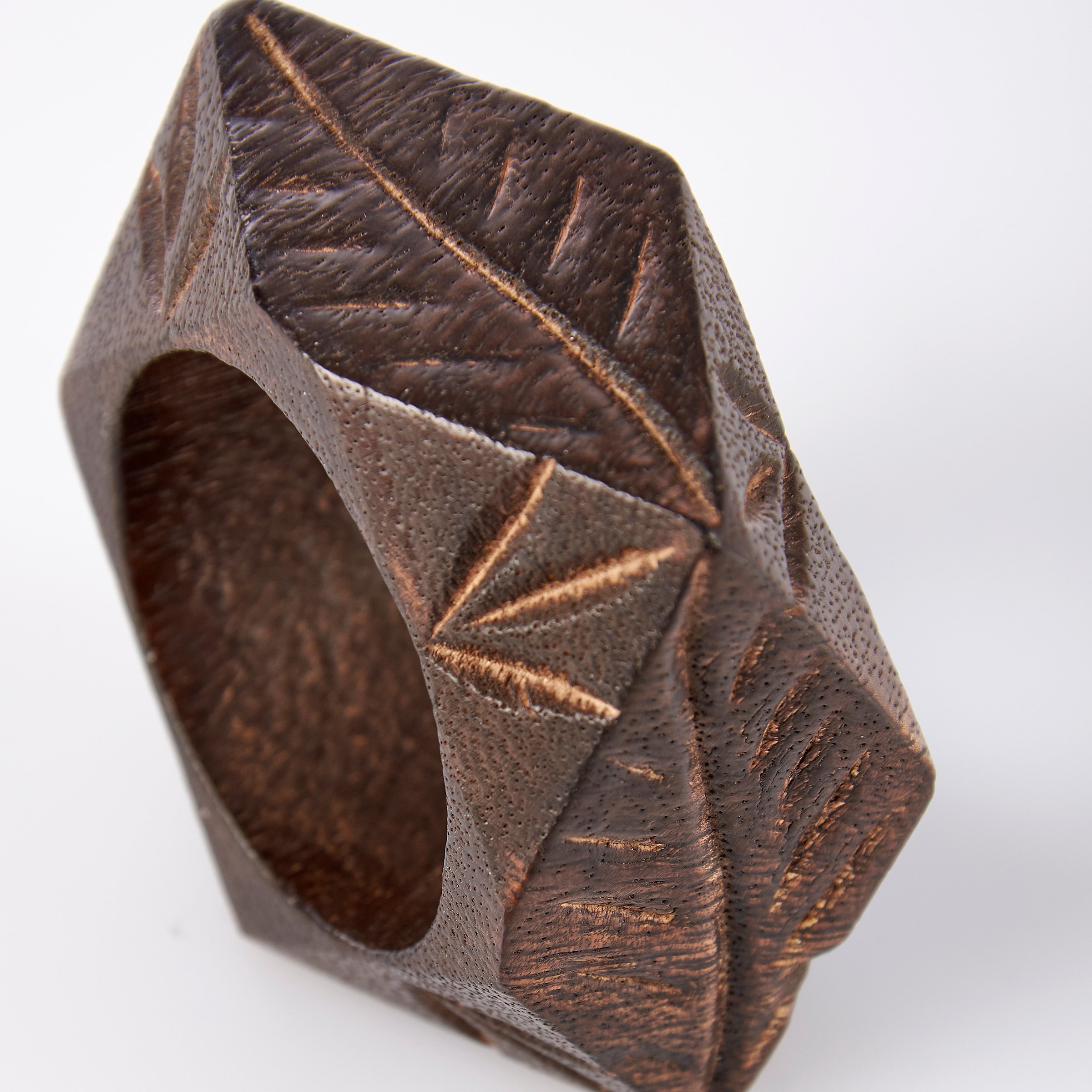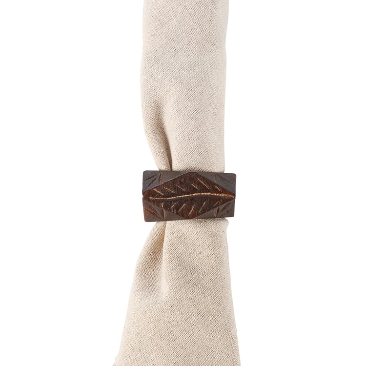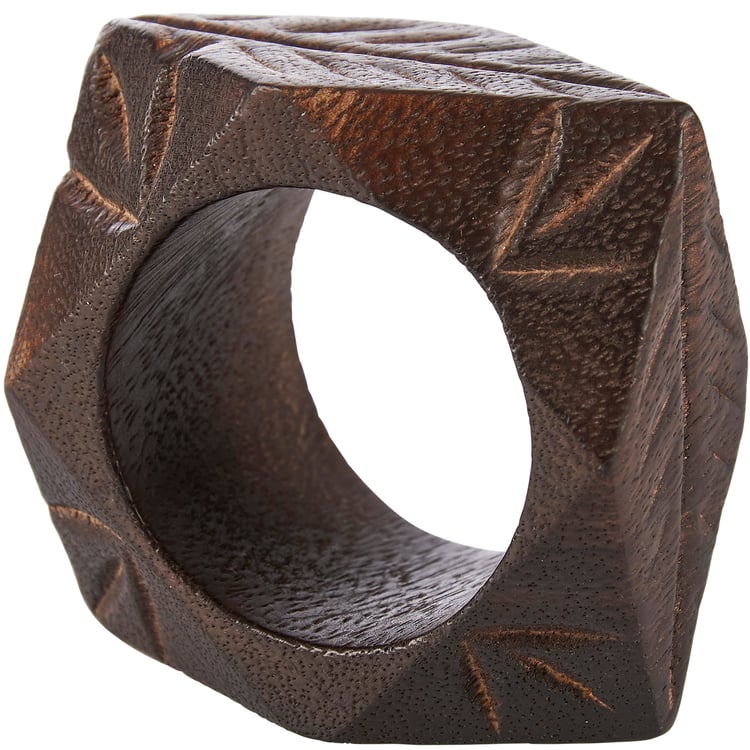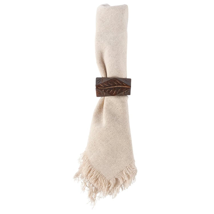 A wooden napkin ring from our Cottagecore Collection featuring dark natural wood with carved designs throughout. Our Rustic Carved napkin ring easily slips over rolled napkin. Napkin pictured not included. A rustic tabletop accessory perfect for everyday gatherings.