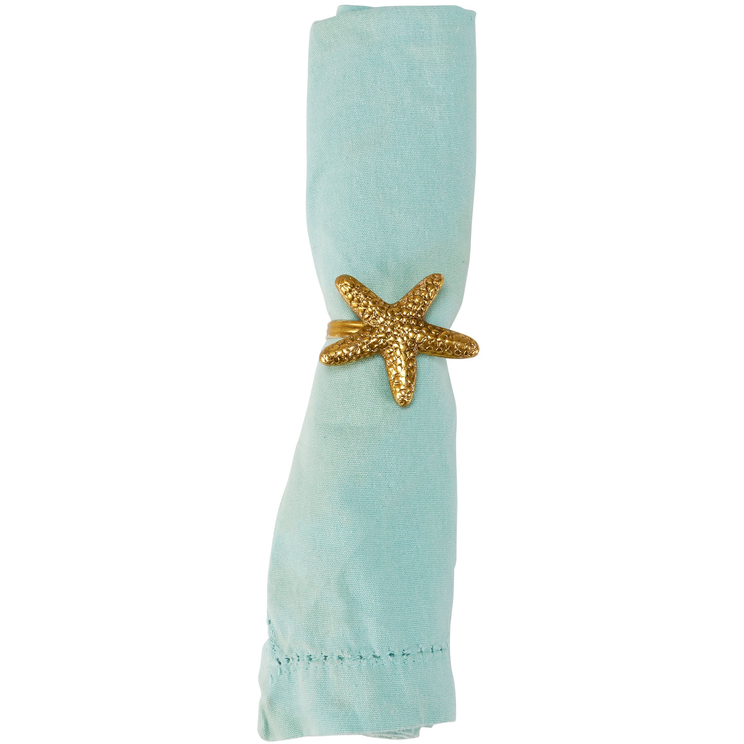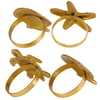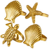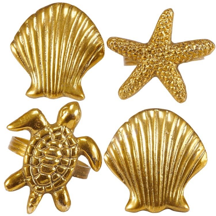 A set of four metal napkin rings from our Beach Collection featuring sculpted beach inspired designs including seashells, starfish, and sea turtle. Our Beach napkin rings include attached metal rings that easily slip over rolled napkins and, when not in use, can be added to table setting as table décor. Napkins pictured not included. Beach napkin rings are a fun set of tabletop accessories perfect for beach-themed tablescapes.