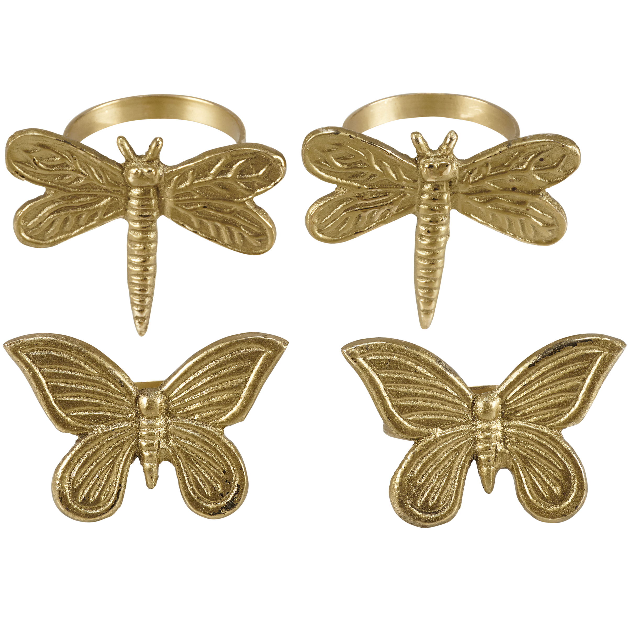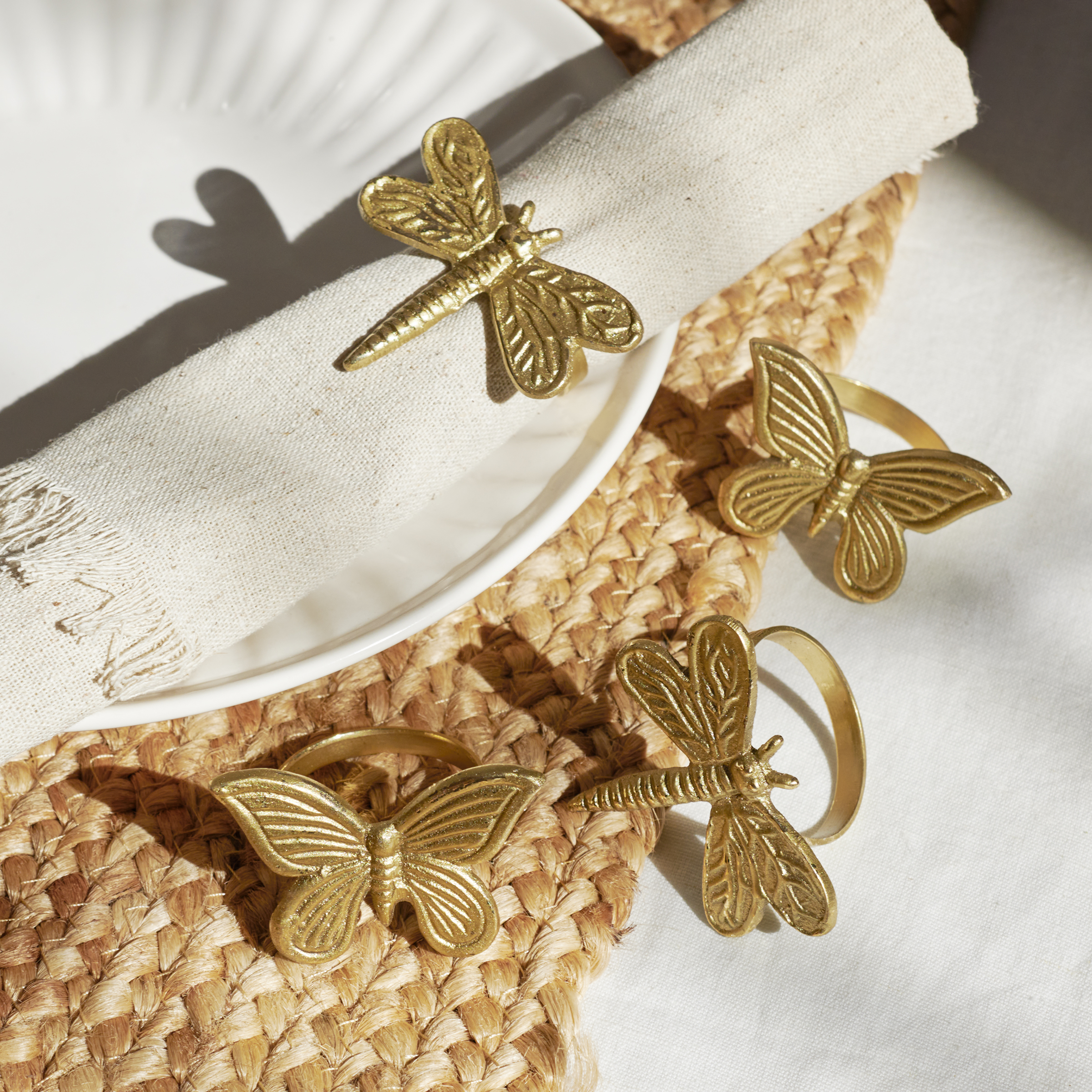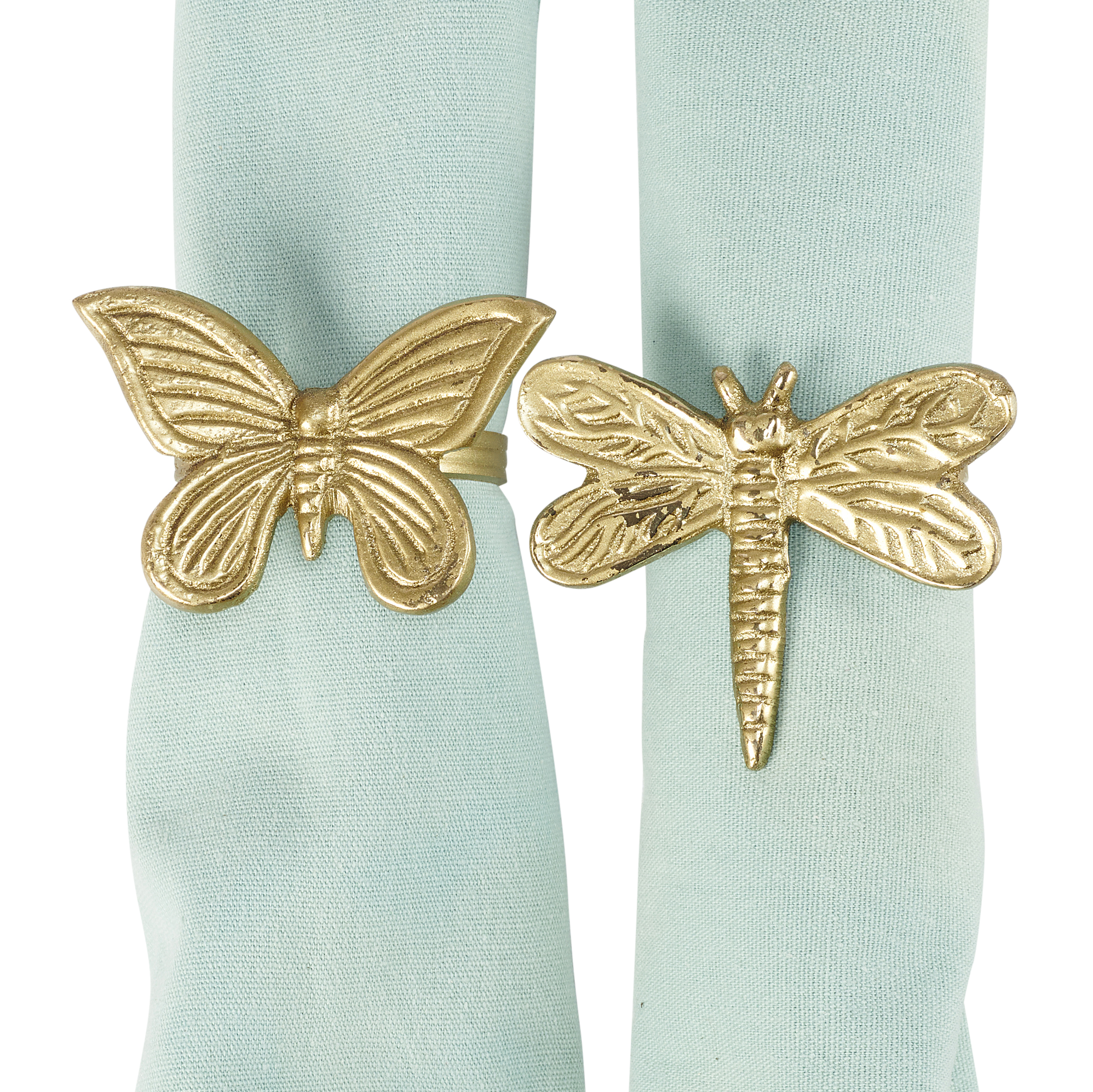 A set of four metal napkin rings from our Garden Collection featuring sculpted insect inspired designs including two dragonflies and two butterflies. Our Insects napkin ring set includes attached metal rings that easily slip over rolled napkins and, when not in use, can be added to table setting as a seasonal accents. Napkins pictured not included. A fun set of tabletop accessories perfect for seasonal gatherings.