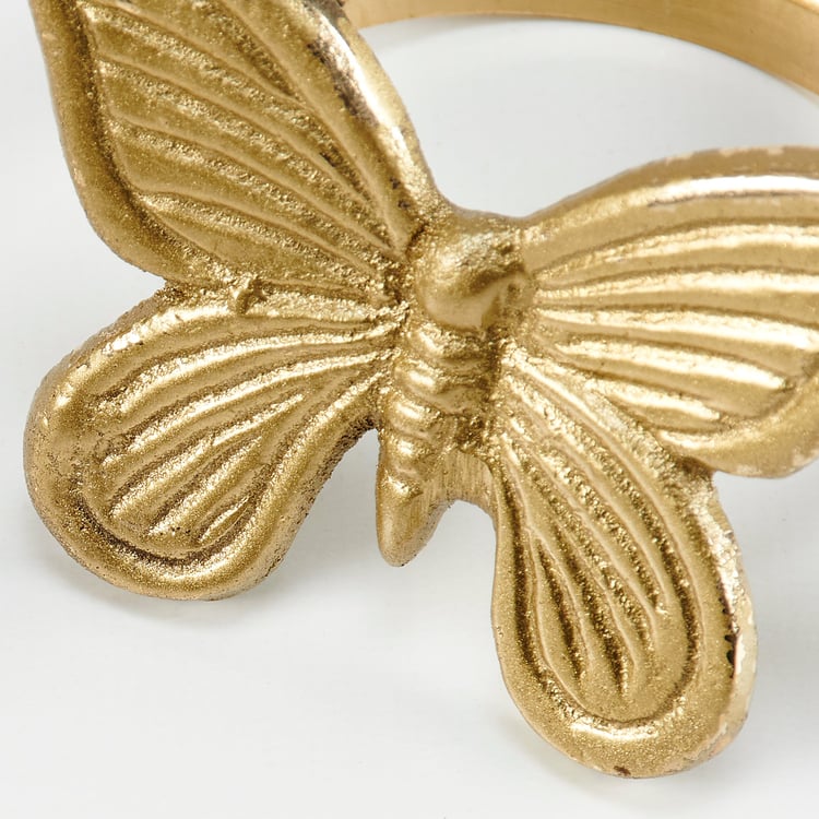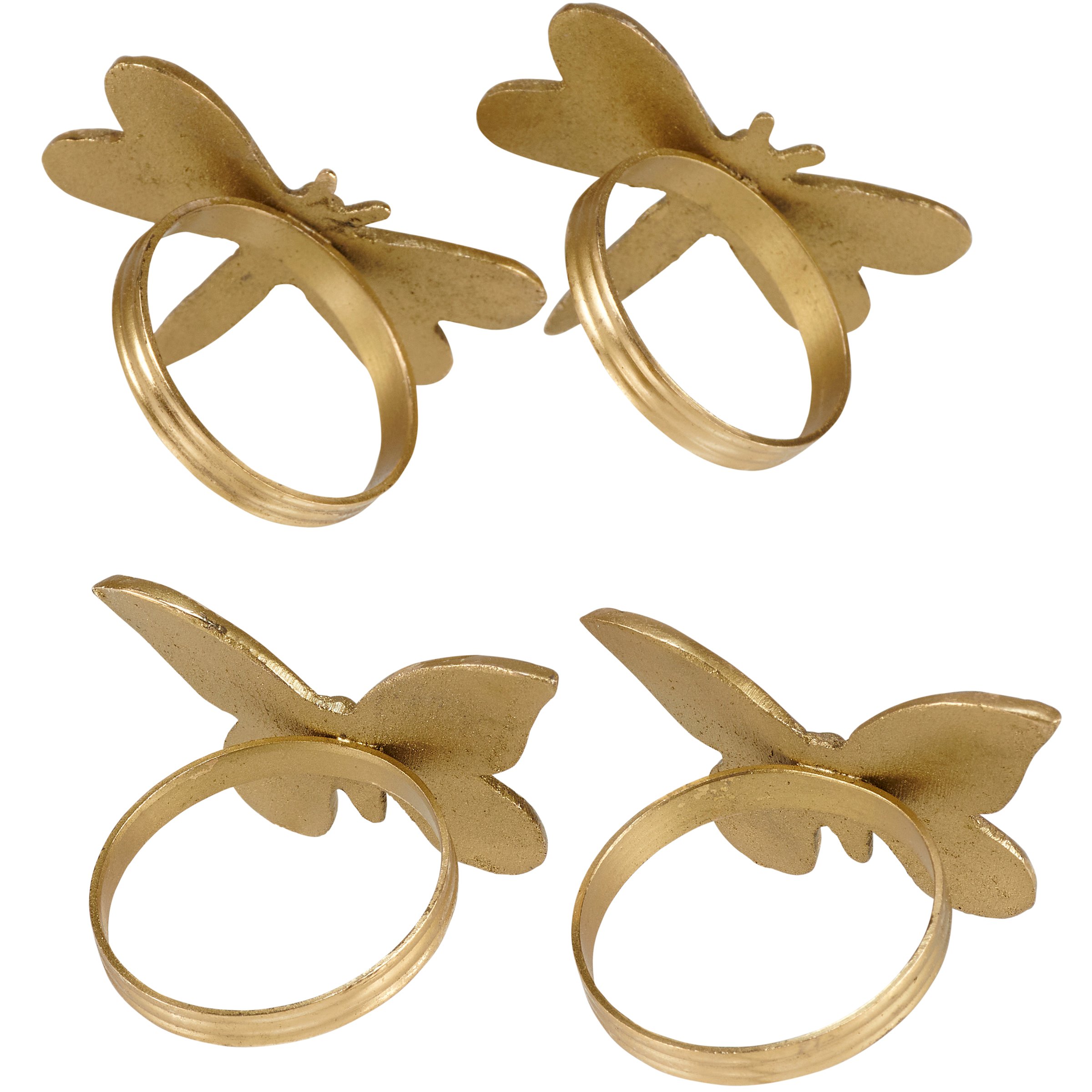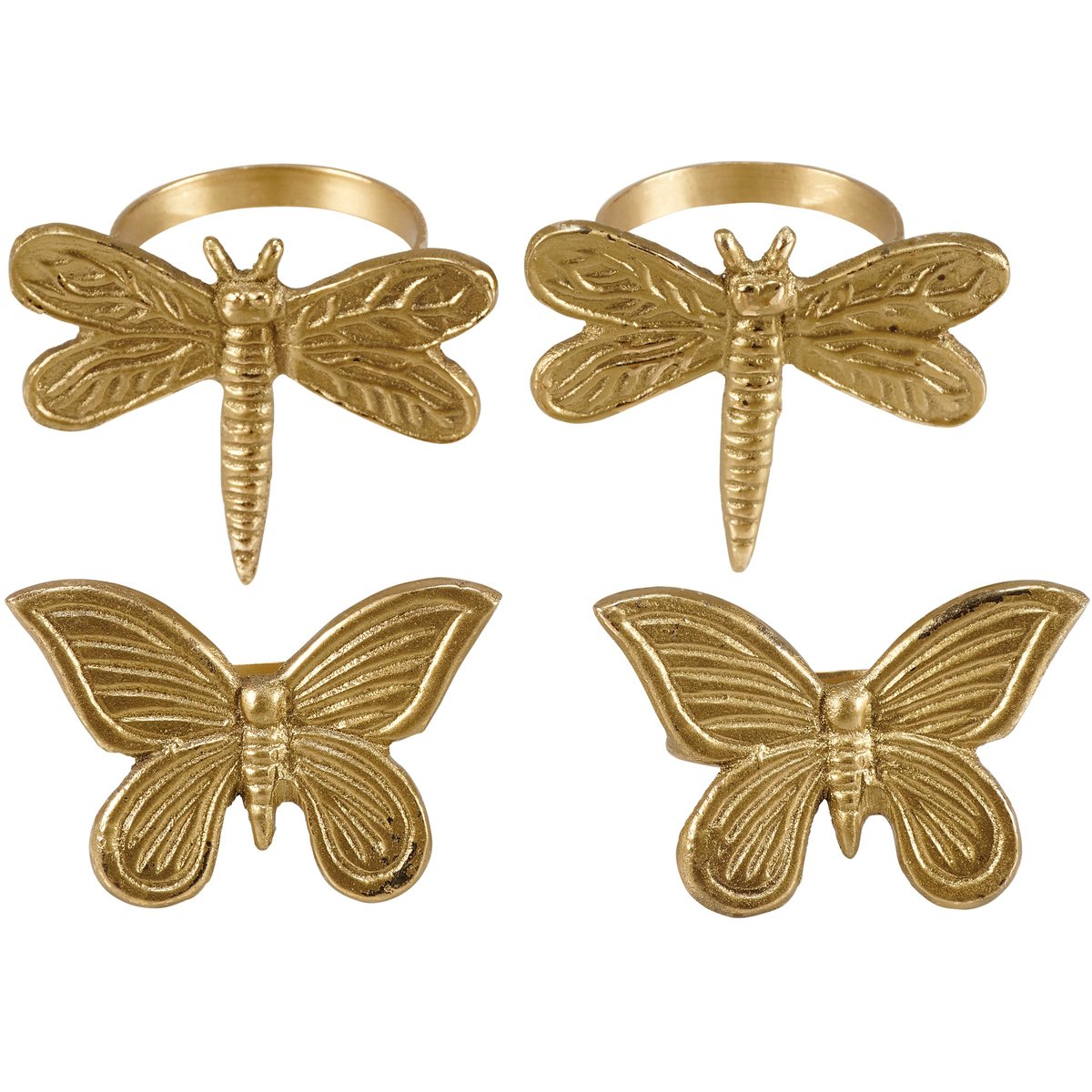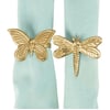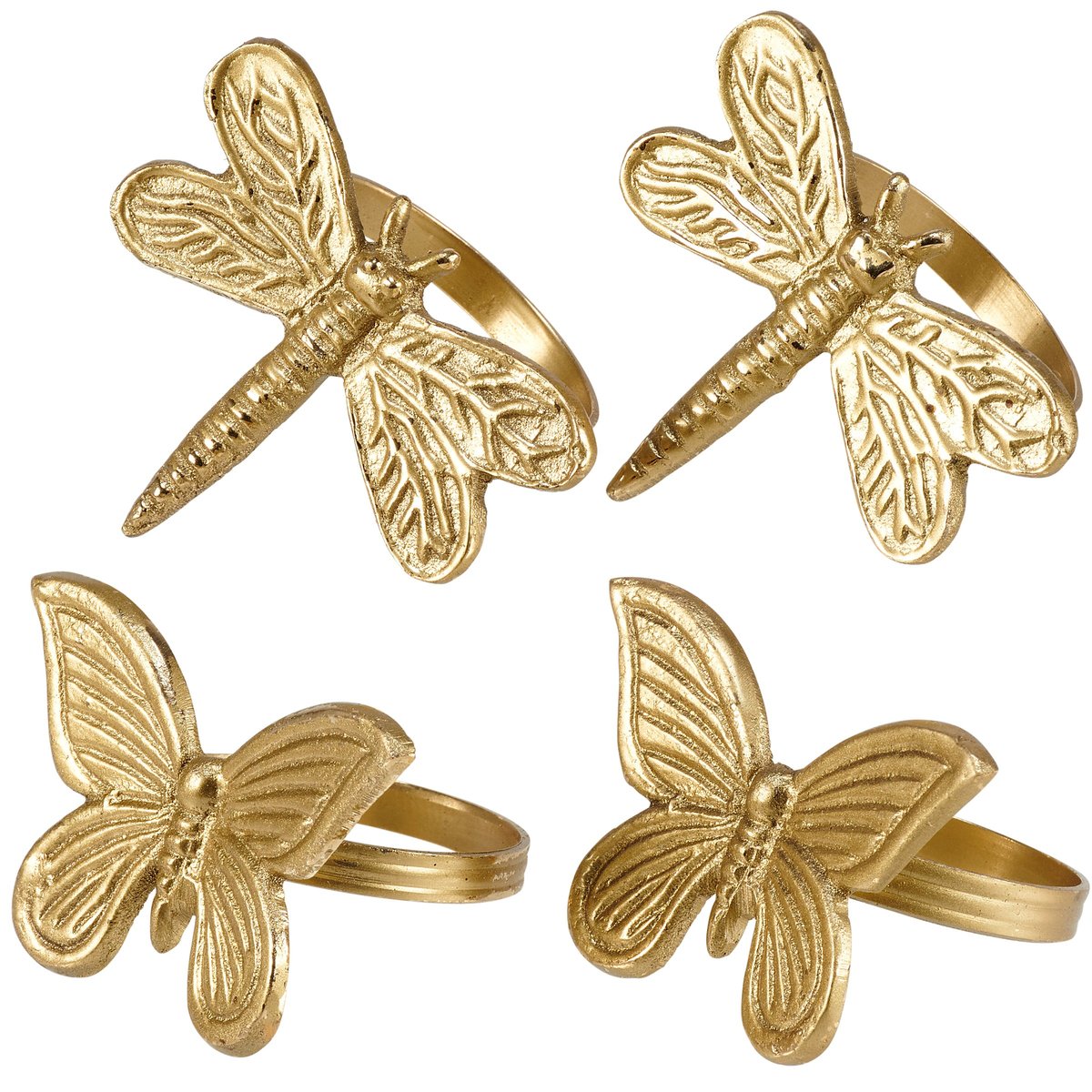 A set of four metal napkin rings from our Garden Collection featuring sculpted insect inspired designs including two dragonflies and two butterflies. Our Insects napkin ring set includes attached metal rings that easily slip over rolled napkins and, when not in use, can be added to table setting as a seasonal accents. Napkins pictured not included. A fun set of tabletop accessories perfect for seasonal gatherings.