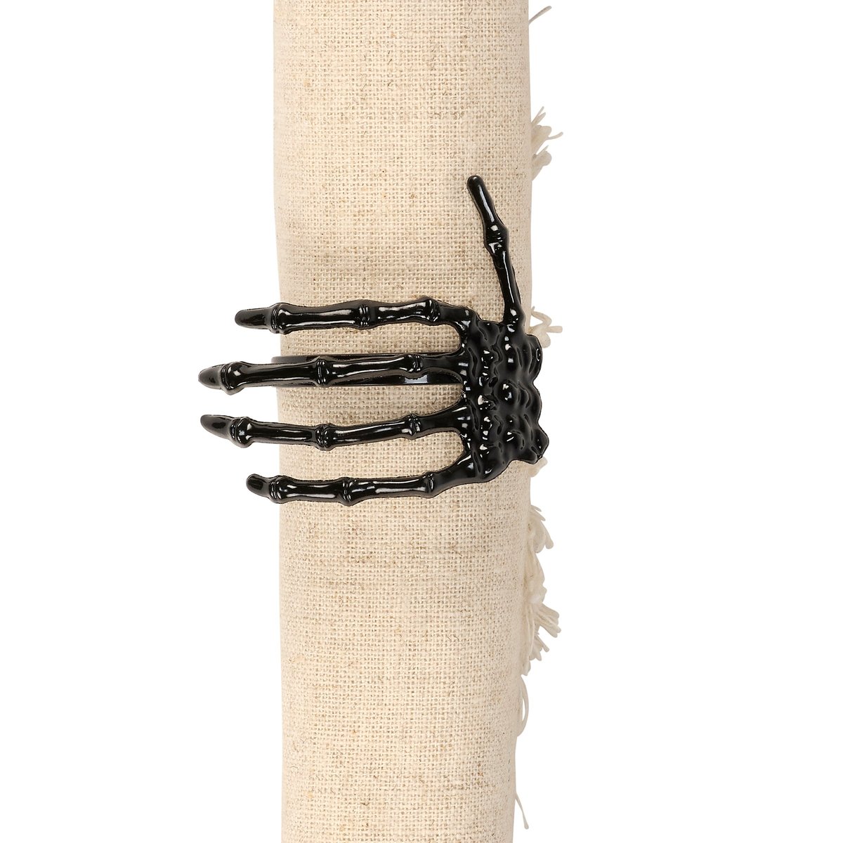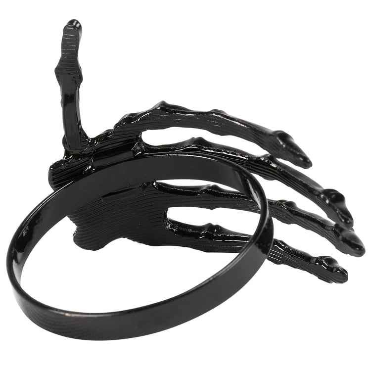 A metal napkin ring from our Halloween Collection featuring a sculpted skeleton hand in glossy black color. Our Skeleton Hand napkin ring is attached to black metal ring that easily slips over rolled napkin and, when not in use, can be added to table setting as table décor. Napkin pictured not included. A fun tabletop accessory perfect for seasonal tablescapes.