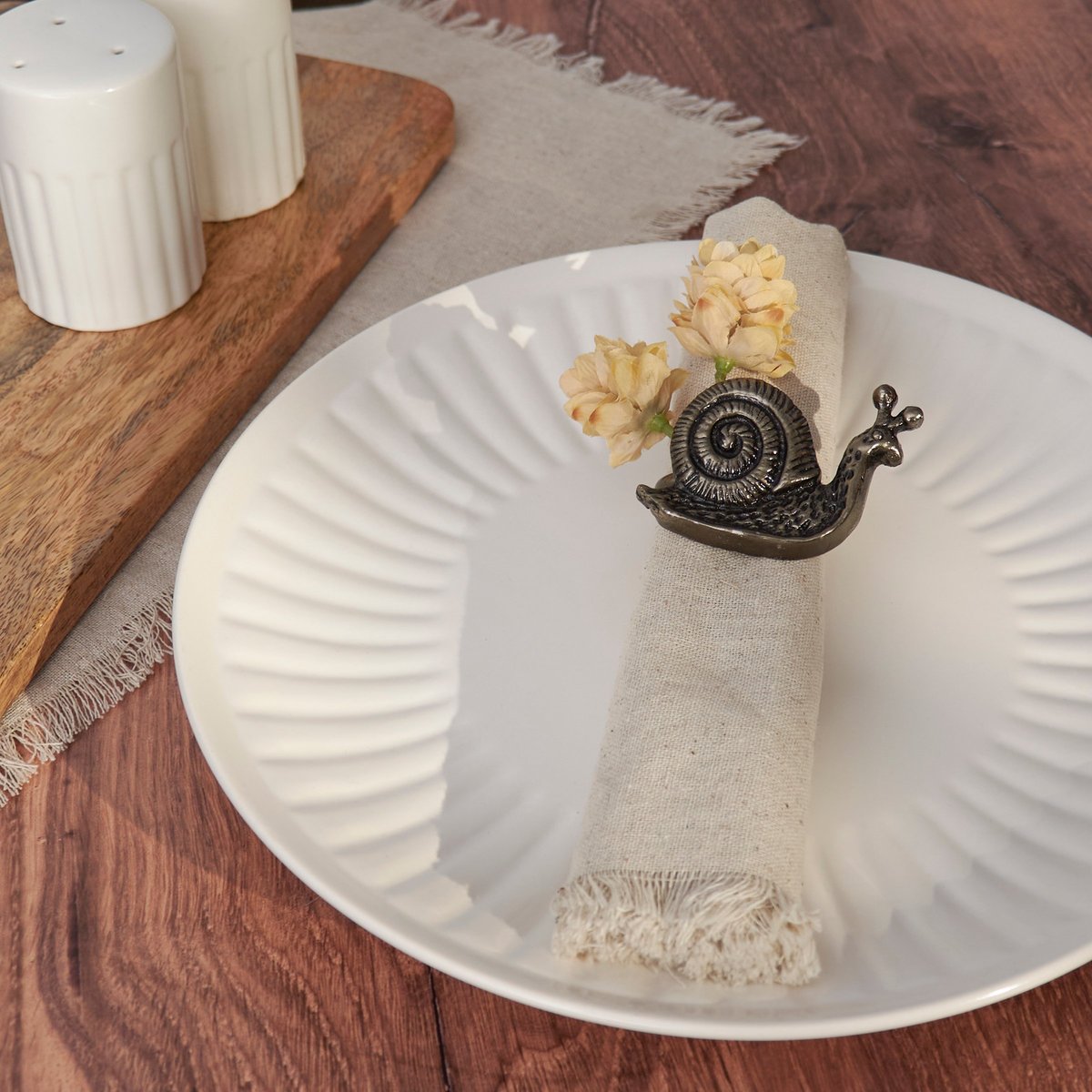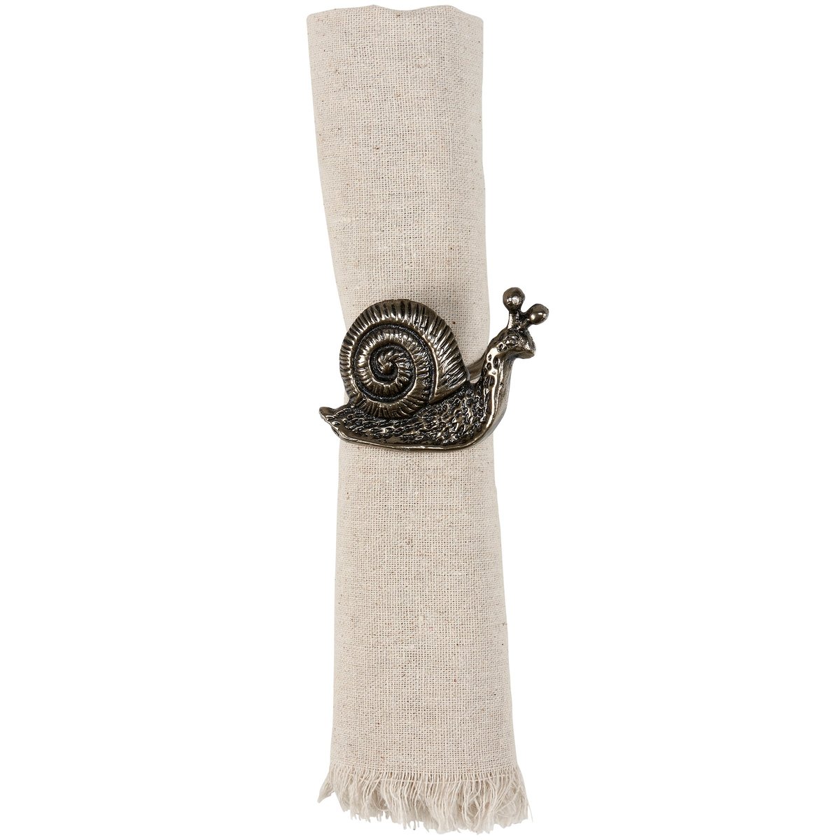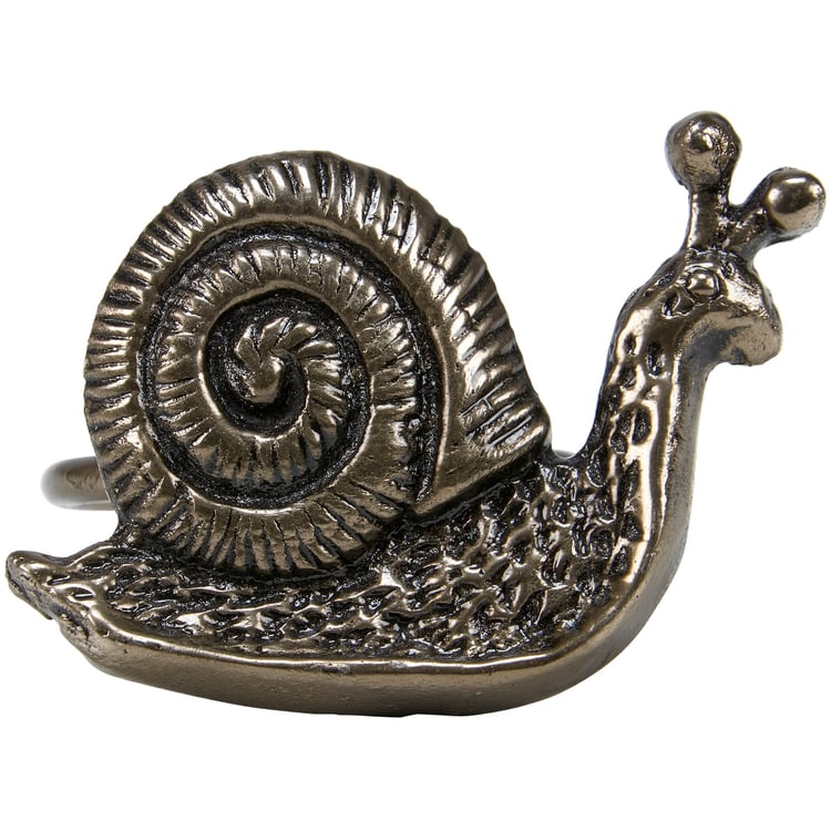 A metal napkin ring from our Cottagecore Collection featuring a detailed snail design with an antique metal appearance. Our Snail napkin ring includes attached metal ring that easily slips over rolled napkin and can be added to table setting when not in use as a rustic accent. Napkin pictured not included. A rustic tabletop accessory perfect for everyday gatherings.