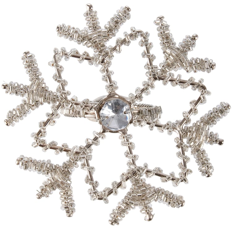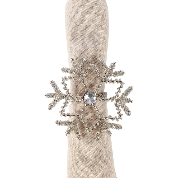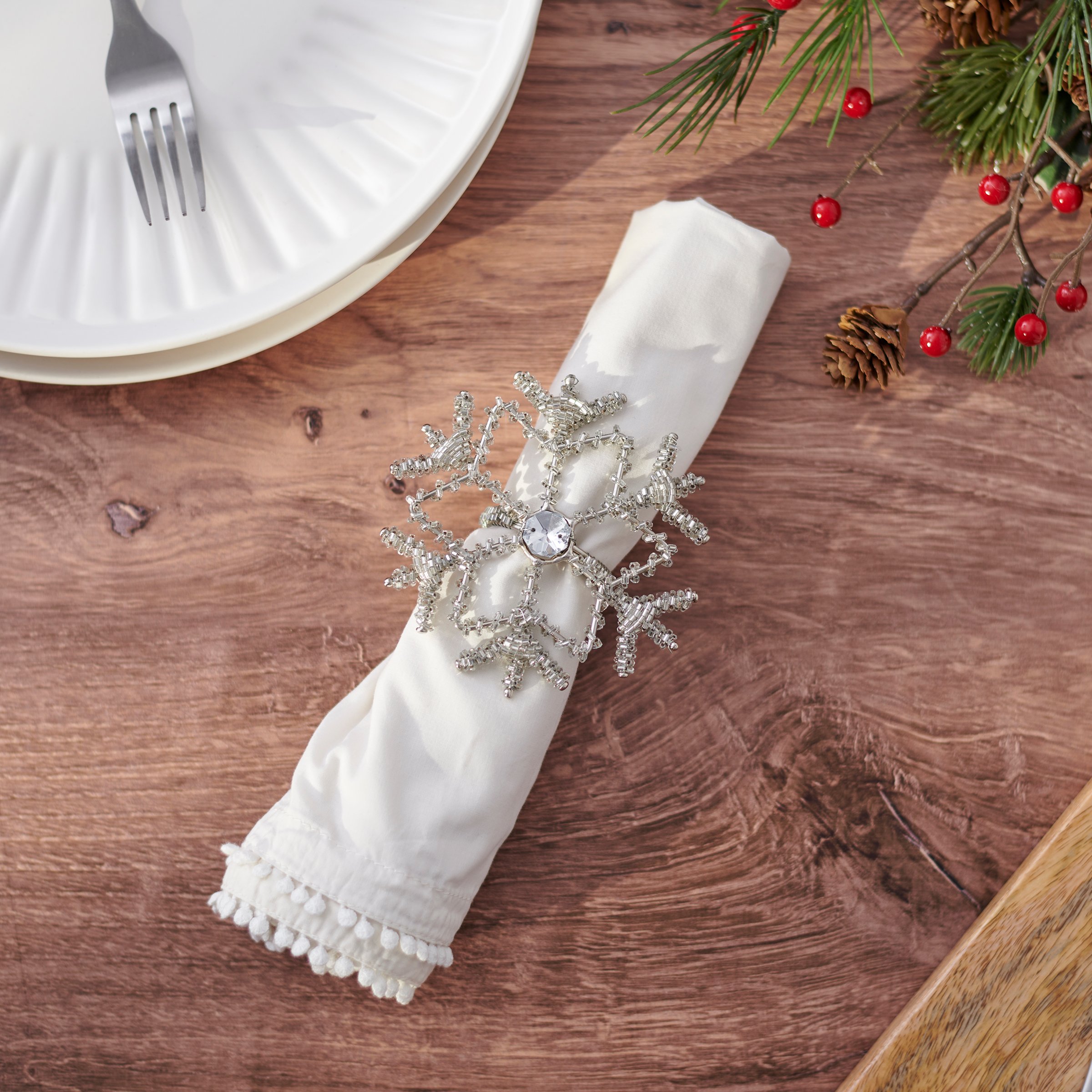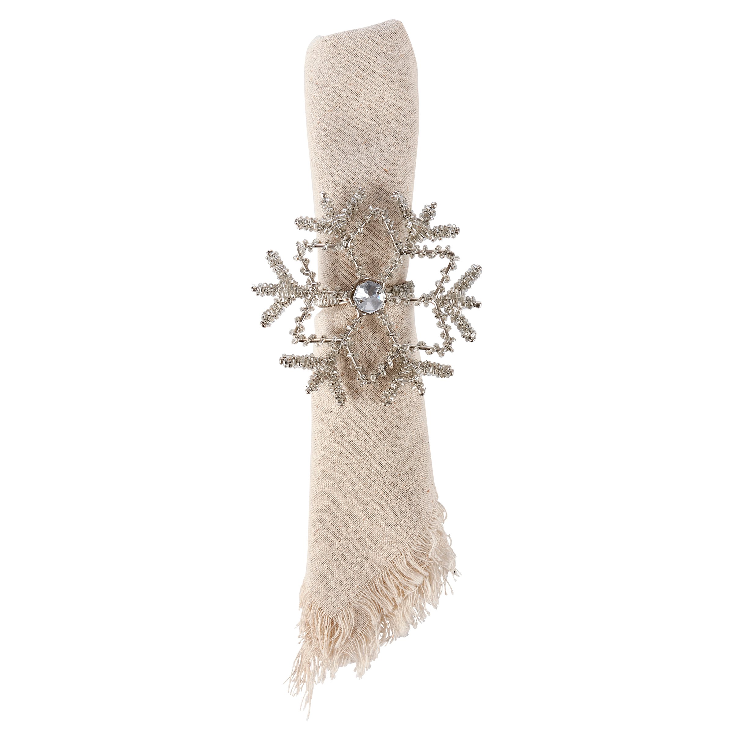 A decorative napkin ring from our Christmas Collection featuring a craft style design of a snowflake with jewel in the center. Our Snowflake napkin ring includes a metal ring to easily slip over rolled napkin and can be added to table setting when not in use as a seasonal accent. Napkin pictured not included. A fun tabletop accessory perfect for seasonal gatherings.