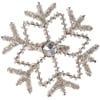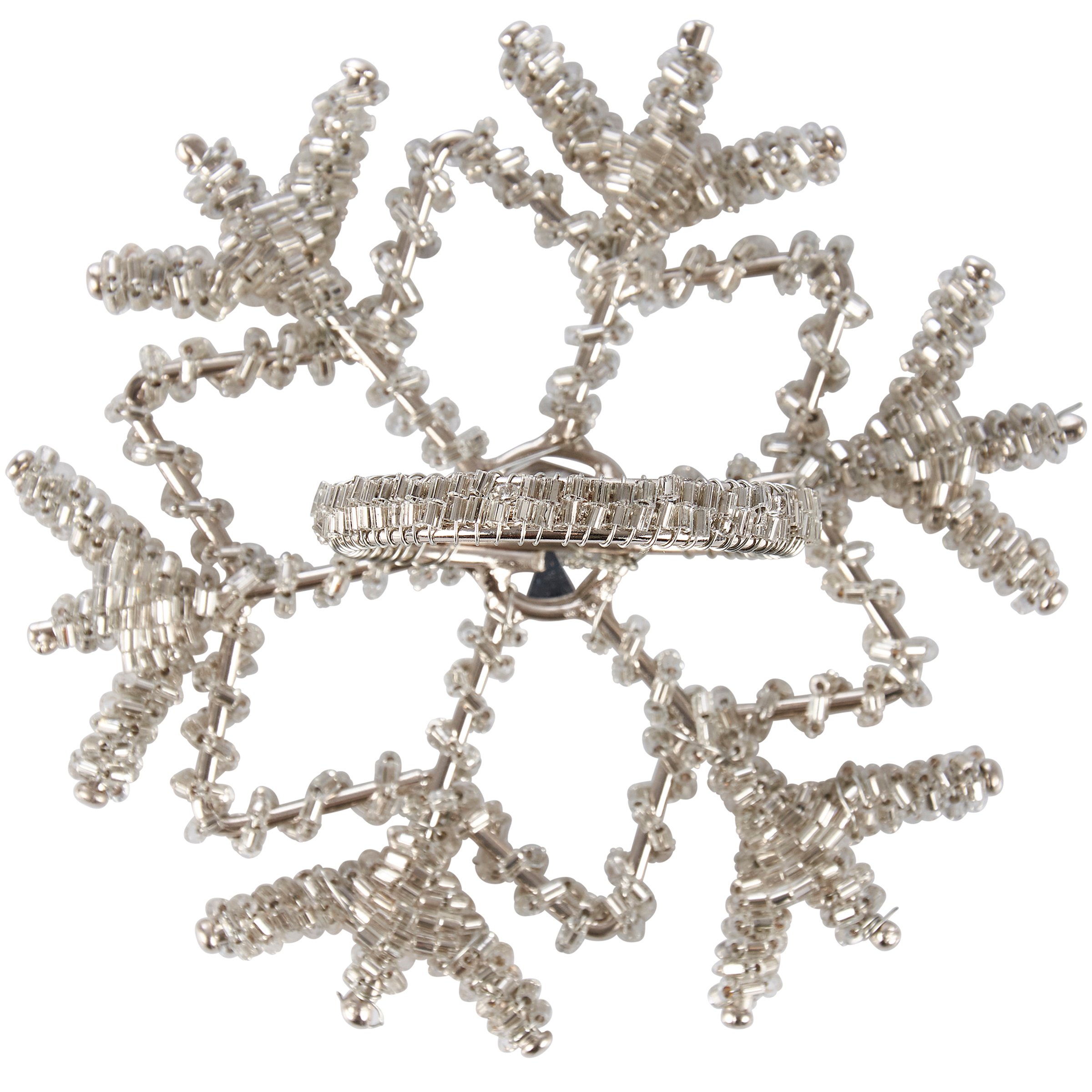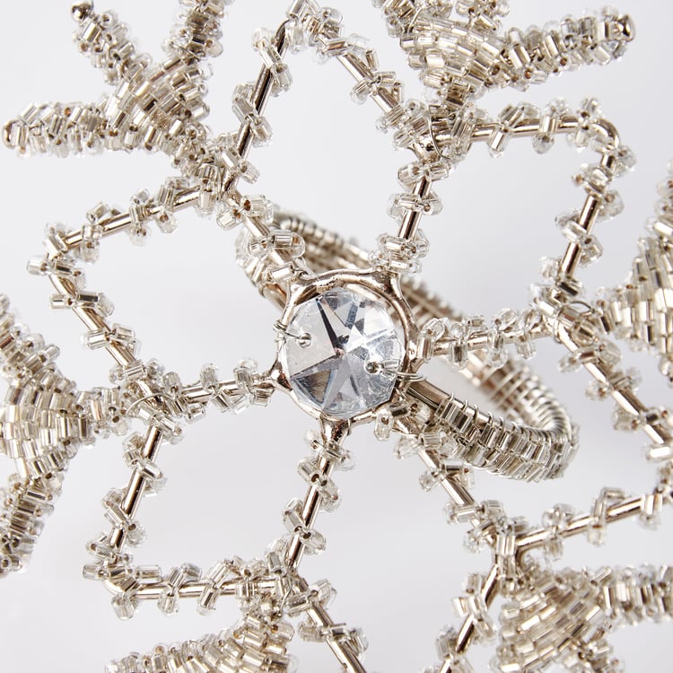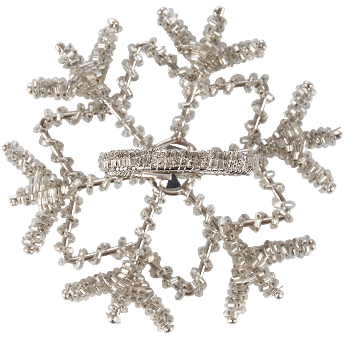 A decorative napkin ring from our Christmas Collection featuring a craft style design of a snowflake with jewel in the center. Our Snowflake napkin ring includes a metal ring to easily slip over rolled napkin and can be added to table setting when not in use as a seasonal accent. Napkin pictured not included. A fun tabletop accessory perfect for seasonal gatherings.