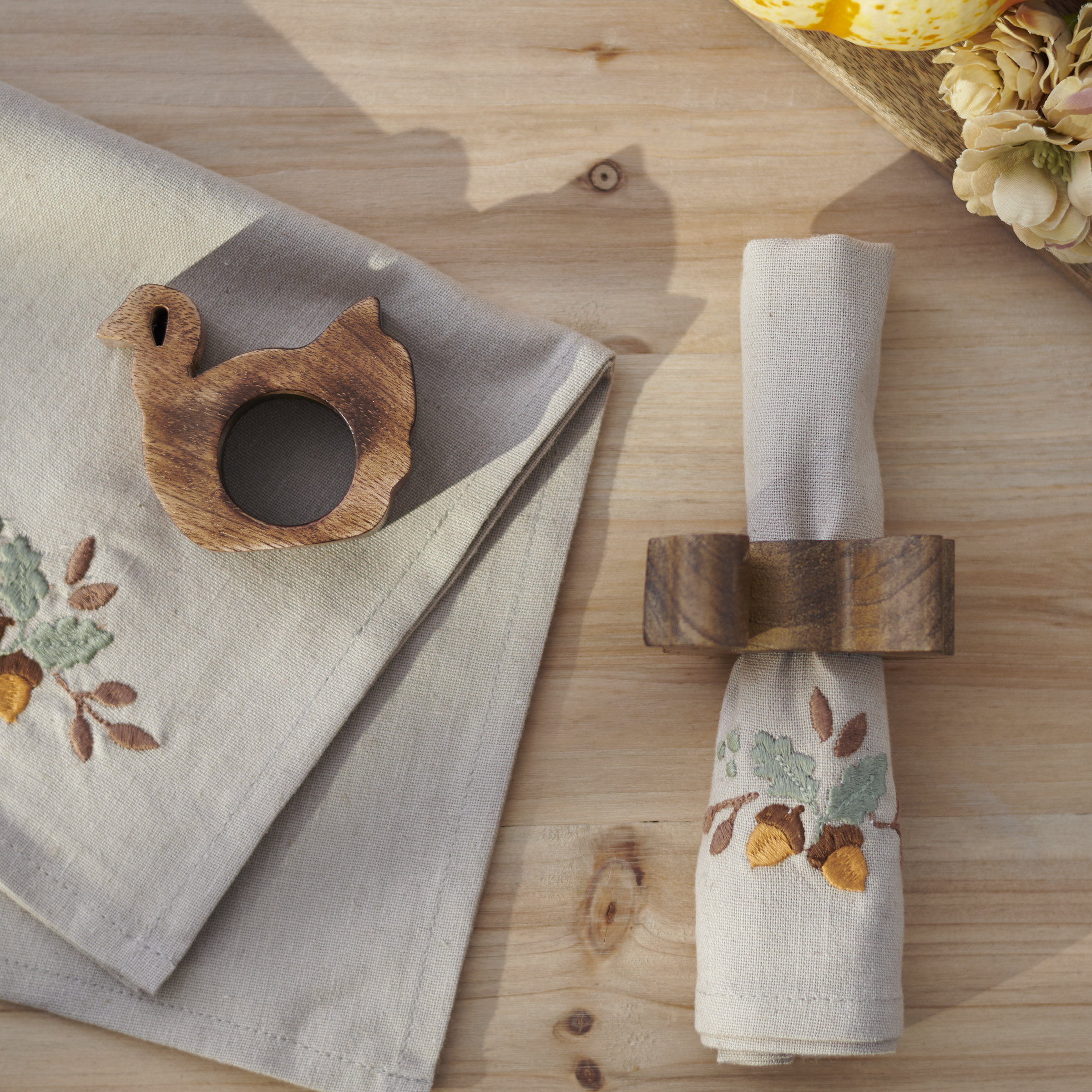 A wooden napkin ring from our Fall & Harvest Collection featuring natural wood with simple turkey design. Our Turkey napkin ring includes a hole in the center to easily slip over rolled napkin. Napkin pictured not included. A rustic tabletop accessory perfect for seasonal gatherings.