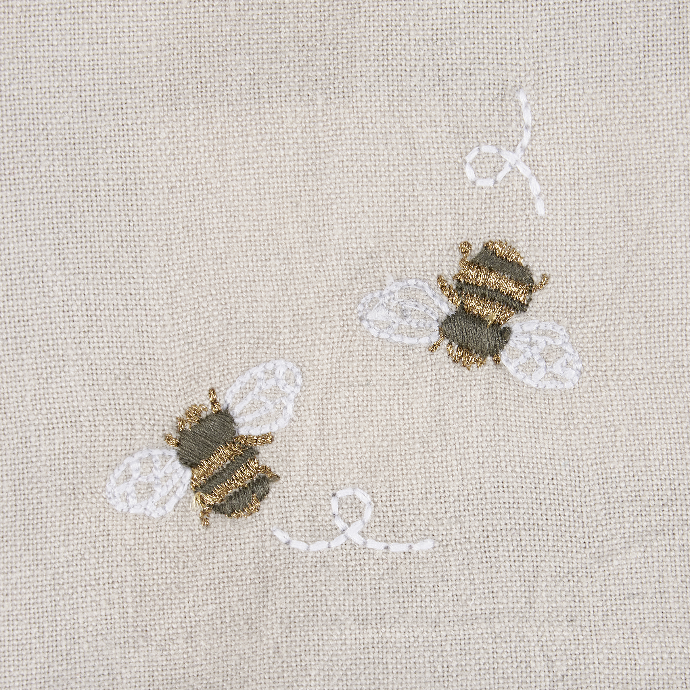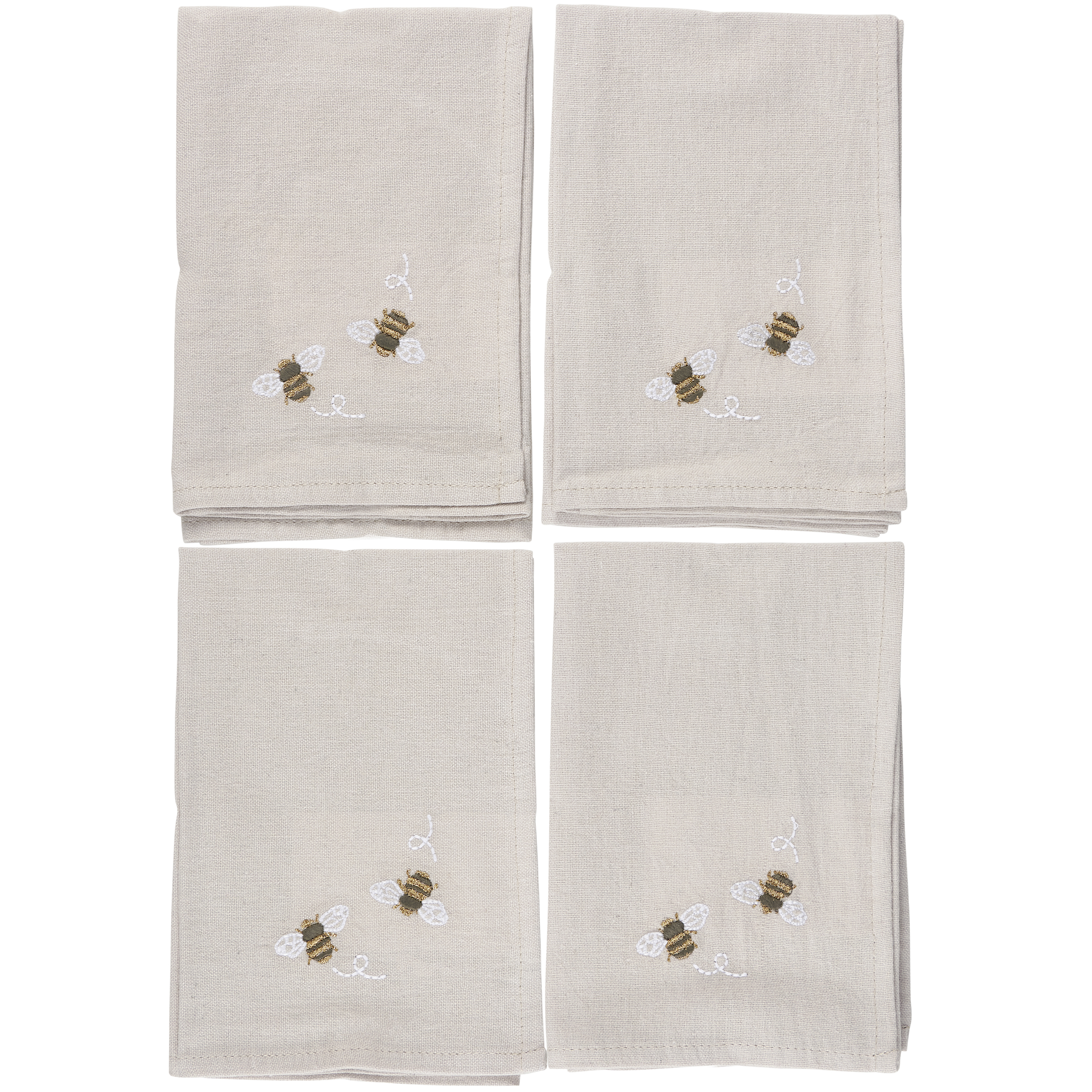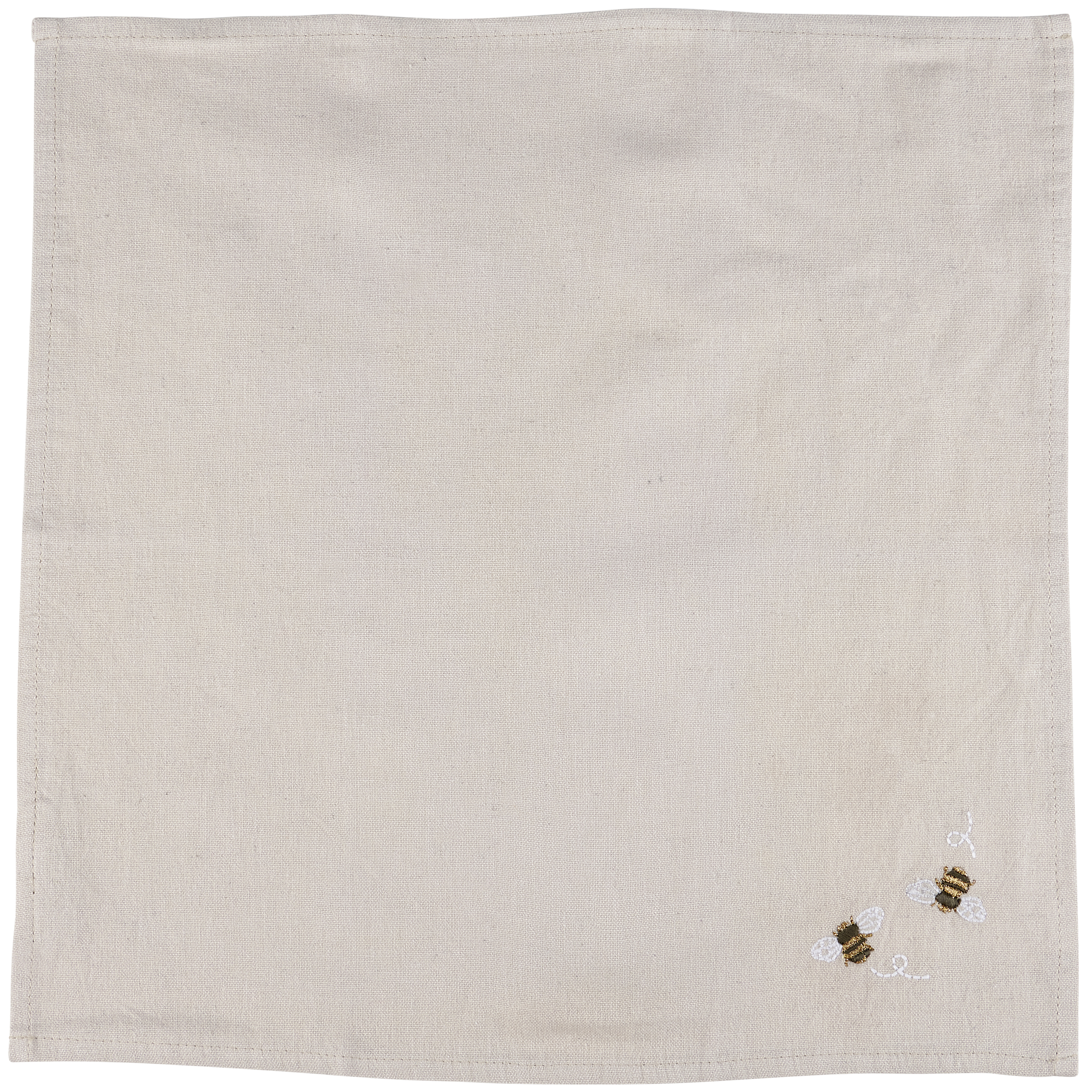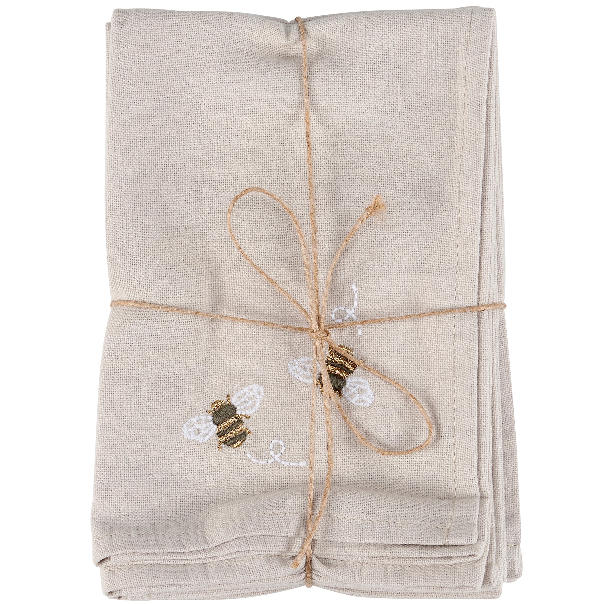 A set of cotton-linen blend napkins from our Garden Collection each displaying an embroidered design of buzzing bees. Our Bees napkin set includes four identical napkins that are machine-washable for convenient cleaning. Napkins are wrapped together with tied jute. A rustic set of tabletop accessories perfect for bee-themed tablescapes.