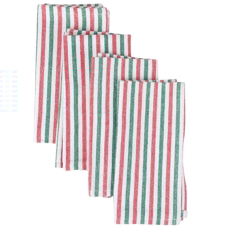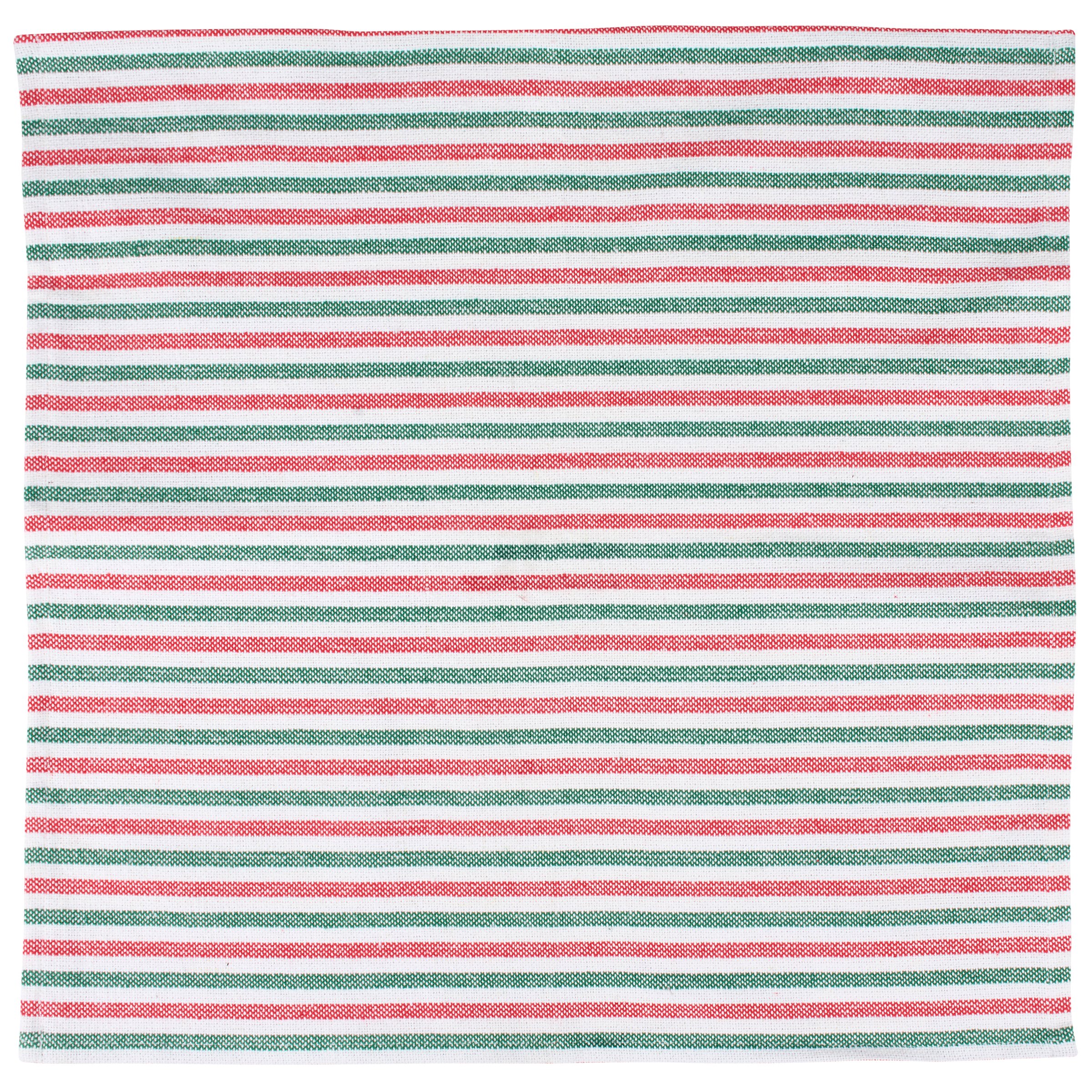 A set of 4 reusable cotton napkins from our Christmas Collection displaying a red, green and white stripe pattern that coordinates with a variety of Christmas styles. Our Christmas Stripe napkin set is conveniently machine washable for easy cleaning and each measures 18 inches by 18 inches for plenty of coverage when in use. A set of Christmas tabletop accessories perfect for seasonal gatherings.