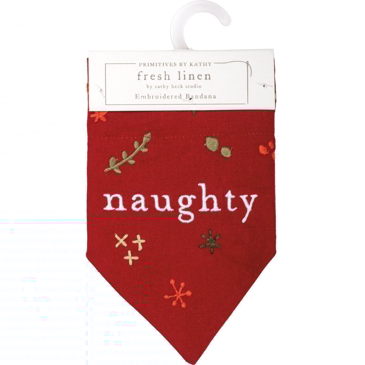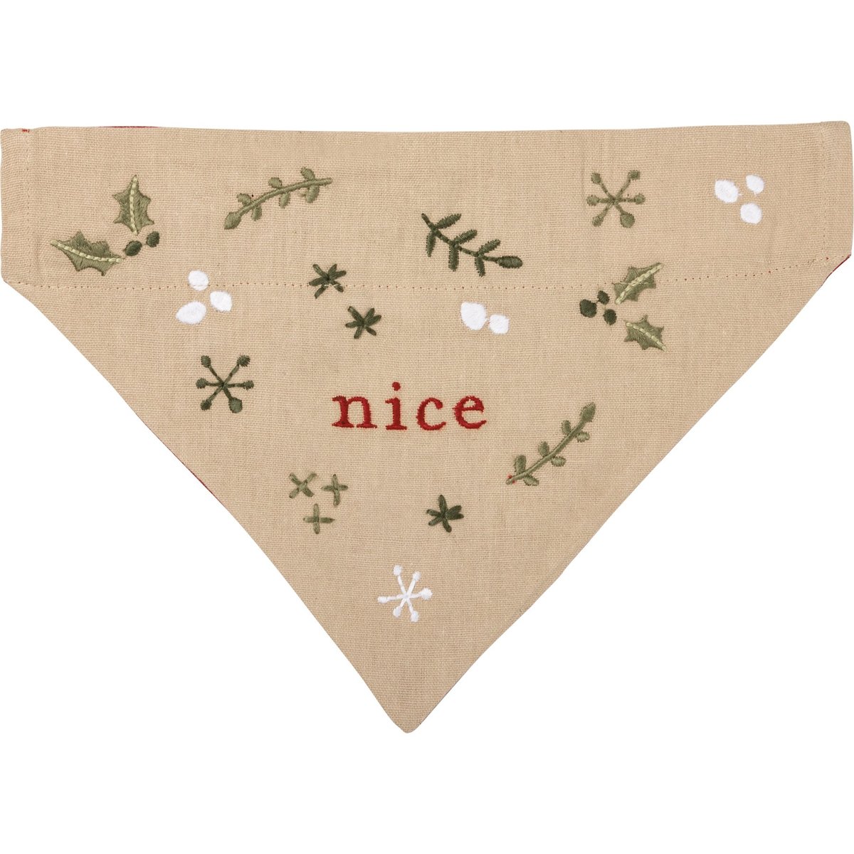 A large reversible cotton linen blend collar bandana. Features an embroidered "Naughty" sentiment and holiday botanical designs on one side, and "Nice" sentiment with holiday botanical designs on the other. Bandana easily slides around standard collars to easily change designs. Machine-washable.