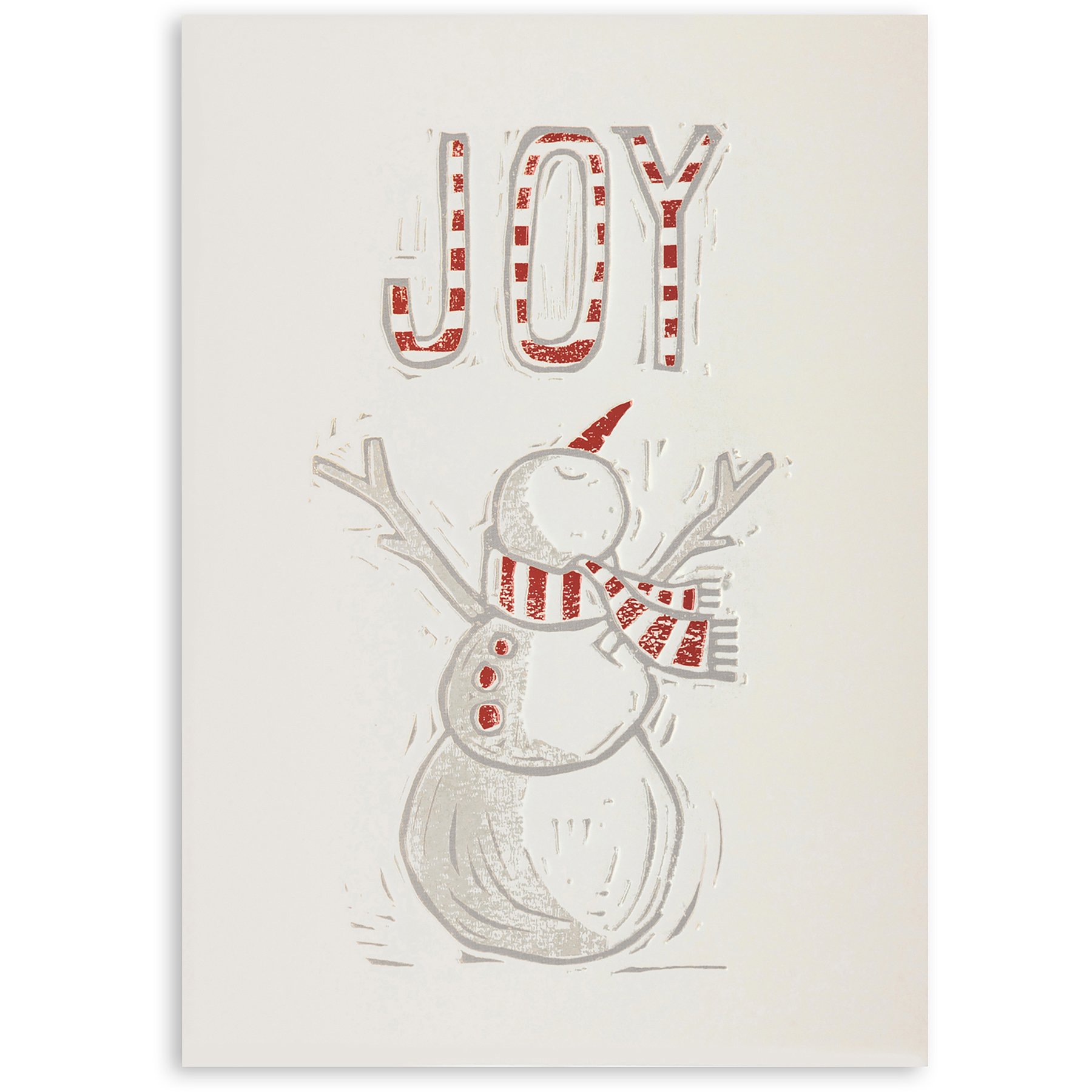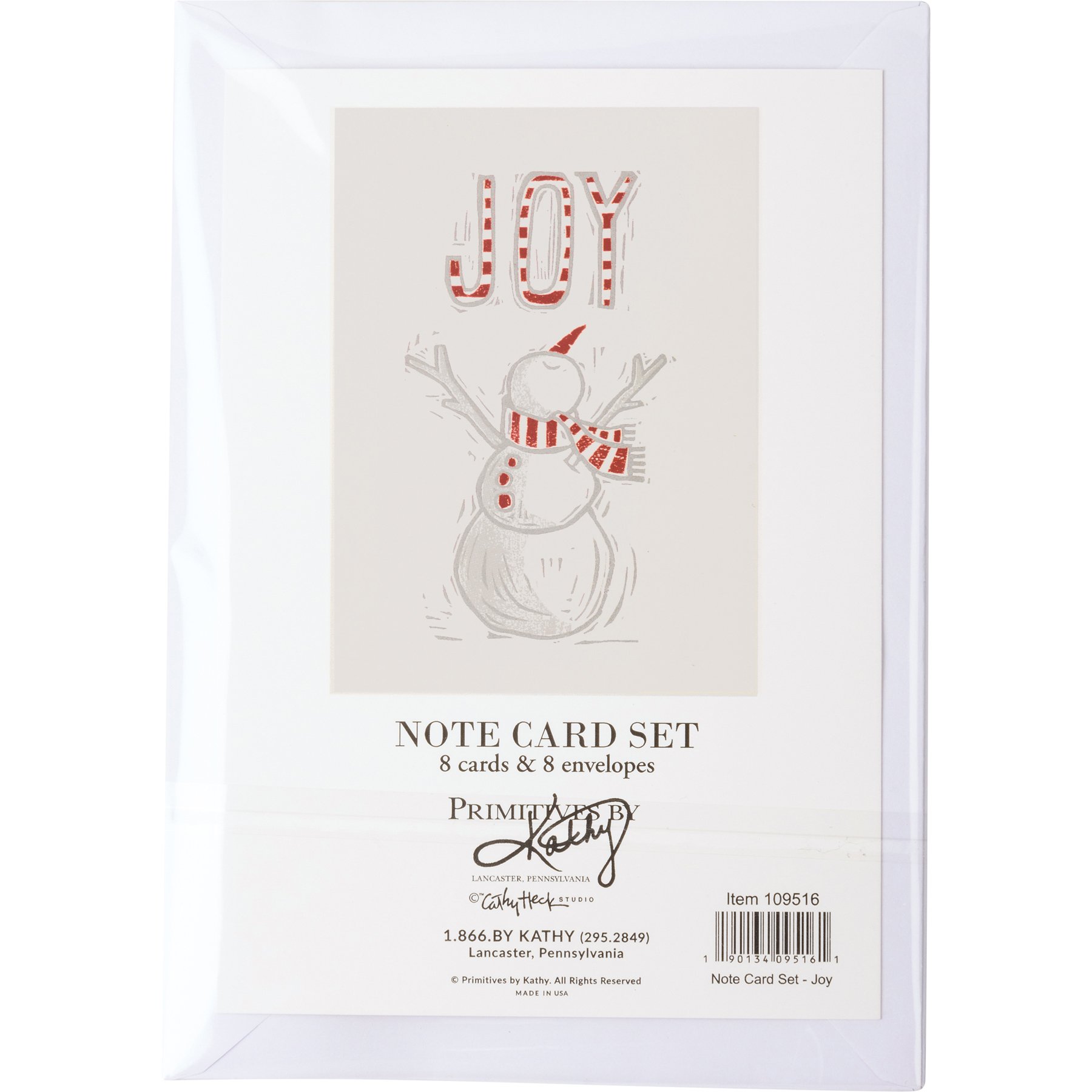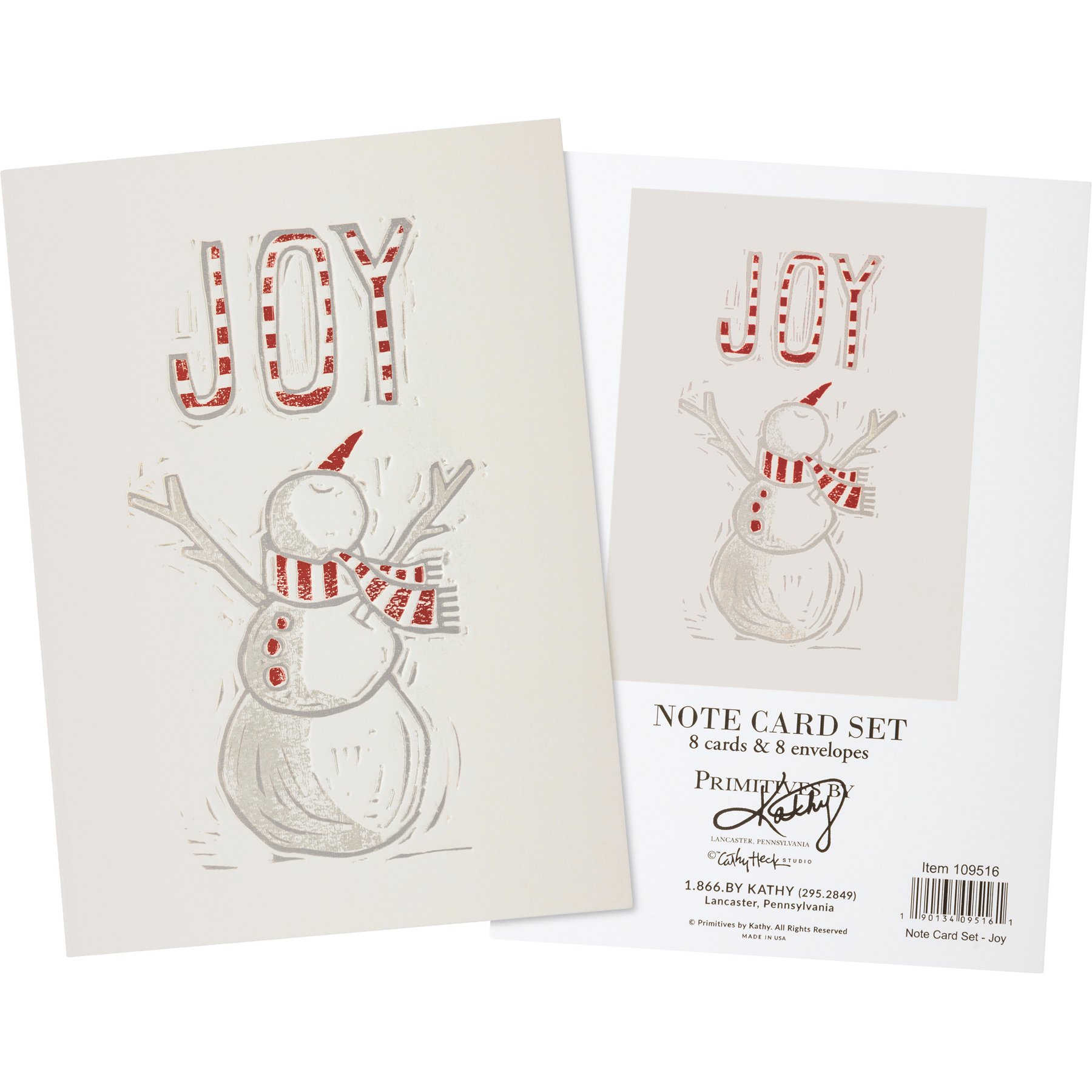 A set of eight notecards featuring rustic block print snowman design and "JOY" sentiment. Cards come in sealed polybag with backer card featuring all designs. Bag features top cutout for easy hanging. Includes eight envelopes.