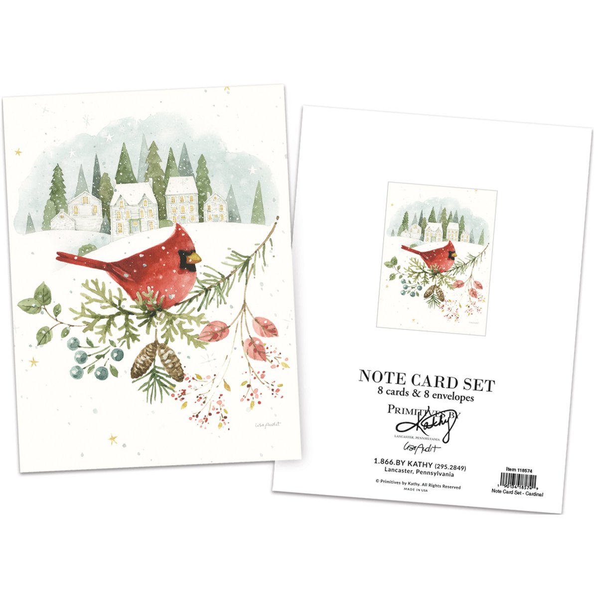 A note card set from our Christmas Collection displaying a charming winter scene of a cardinal on a branch. Card design is replicated from original art hand painted in a delicate watercolor style. Seasonal note card set includes 8 blank cards and envelopes. Cards are sealed in polybag with card back displaying full design. Our white Winter Cardinal note card set is proudly made in the USA. A winter-themed note card set perfect for seasonal moments.