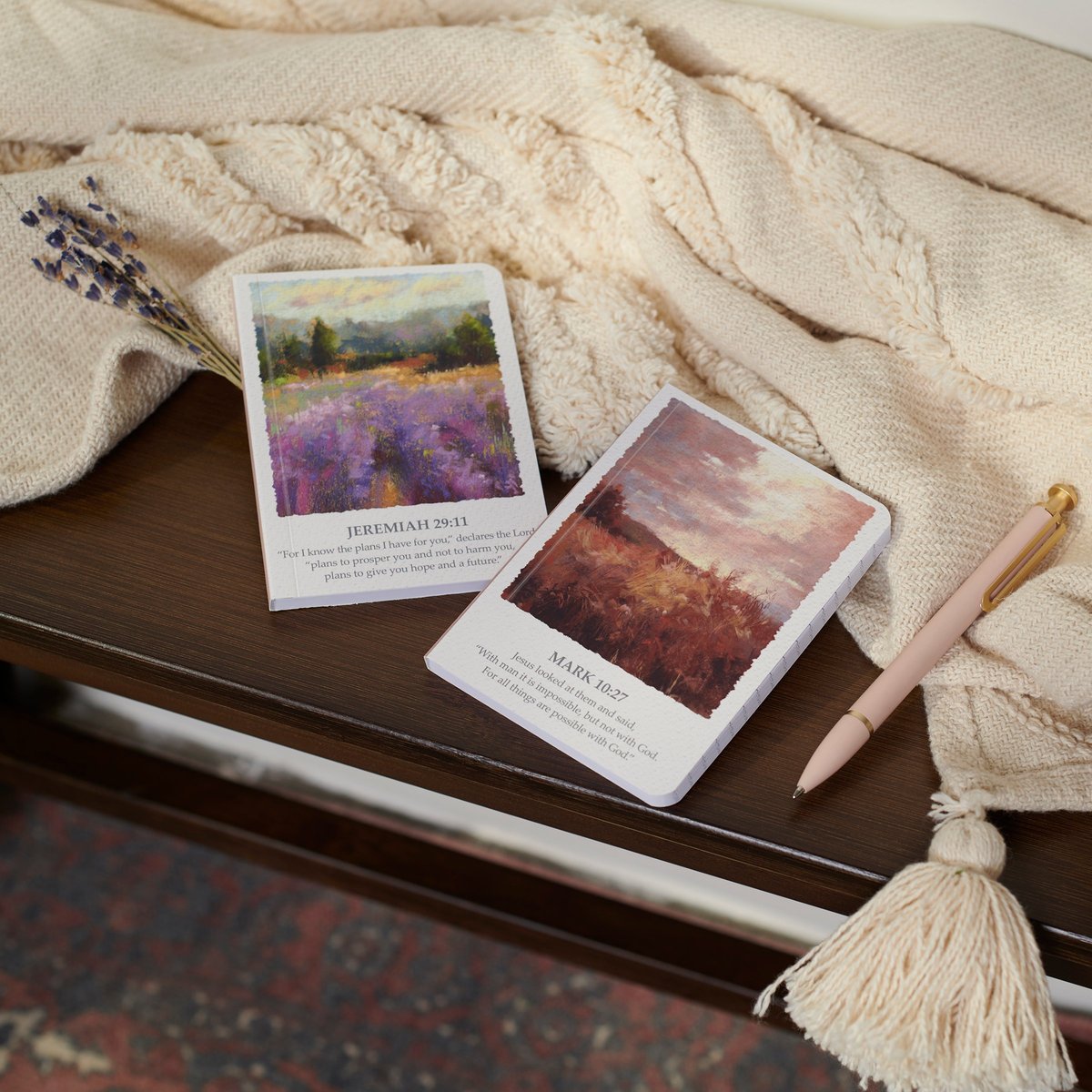 A set of two small notebooks from our Faith Collection displaying calming landscapes replicated from gorgeous original oil pastel artwork with complementing scriptures underneath including Mark 10:27 on one notebook and Jeremiah 29:11 on the other. Each faith notebook contains 50 lined pages inside and features coordinating pink color on the back cover. Our Possible & Prosper notebook set is an inspirational gift perfectly sized to easily fit in a tote, bag, or pocket to take encouragement anywhere and quickly capture moments of inspiration.