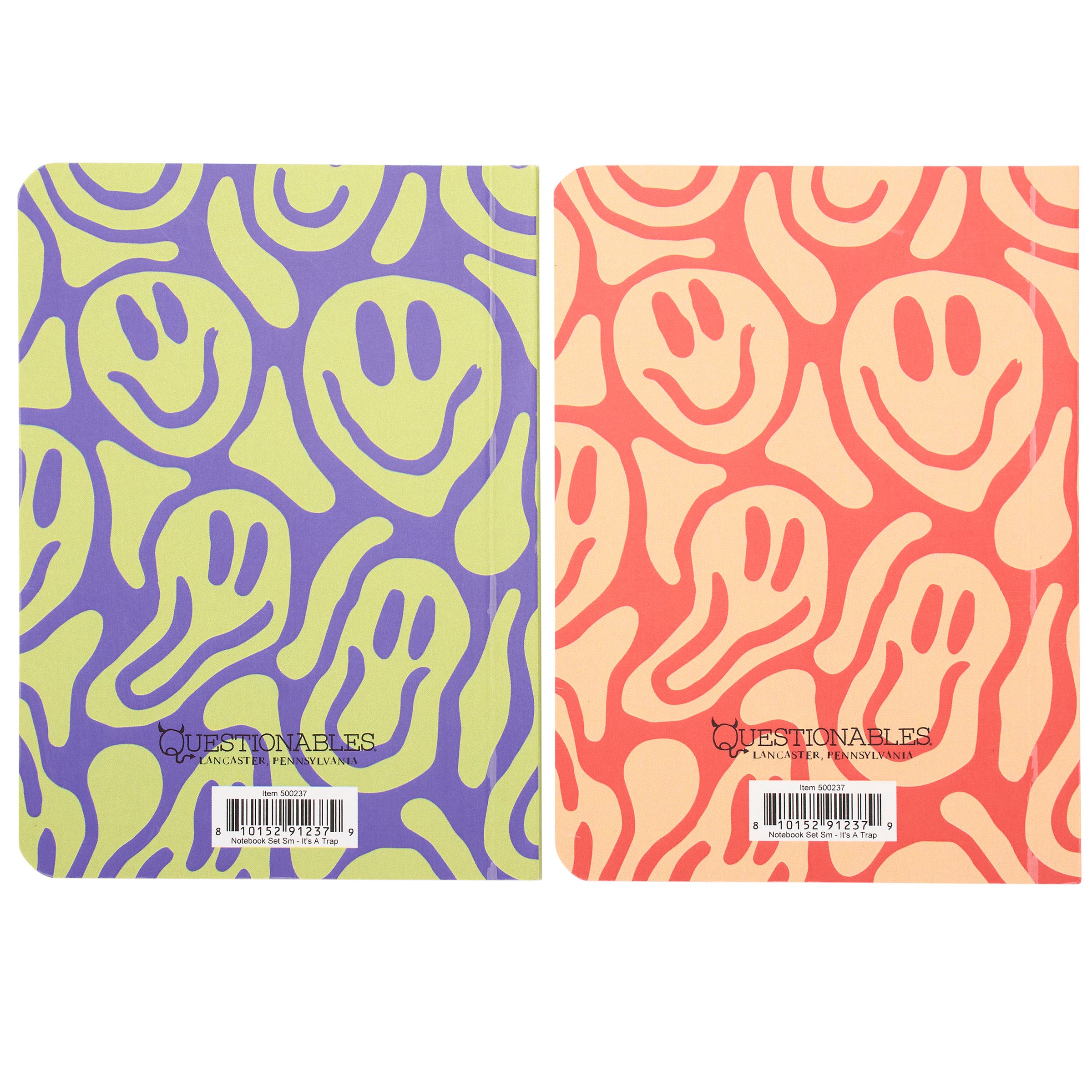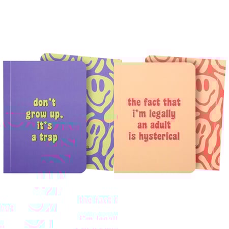 This playful set of mini notebooks is sized to easily fit in a pocket or bag to take everywhere and quickly capture reminders, special moments, or secret thoughts. Each notebook features 56 lined pages with coordinating designs displaying relatable sentiments on the front and fun retro inspired smiley faces on the back. Relatable sentiments include "Don't Grow Up. It's A Trap." on one notebook and "The Fact That I'm Legally An Adult Is Hysterical" on the other notebook. Our Don't Grow Up It's A Trap small notebook set is easily giftable and perfect for taking functional self expression anywhere.
