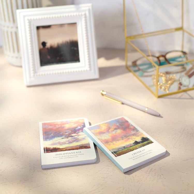 A set of two mini notebooks from our Faith Collection displaying calming landscapes replicated from gorgeous original oil pastel artwork with complementing scriptures underneath including Philippians 4:13 on one notebook and 1 Peter 5:7 on the other. Each faith notebook contains 50 lined pages inside and features coordinating blue color on the back cover. Our Strength & Care notebook set is an inspirational gift perfectly sized to easily fit in a tote, bag, or pocket to take encouragement anywhere and quickly capture moments of inspiration.
