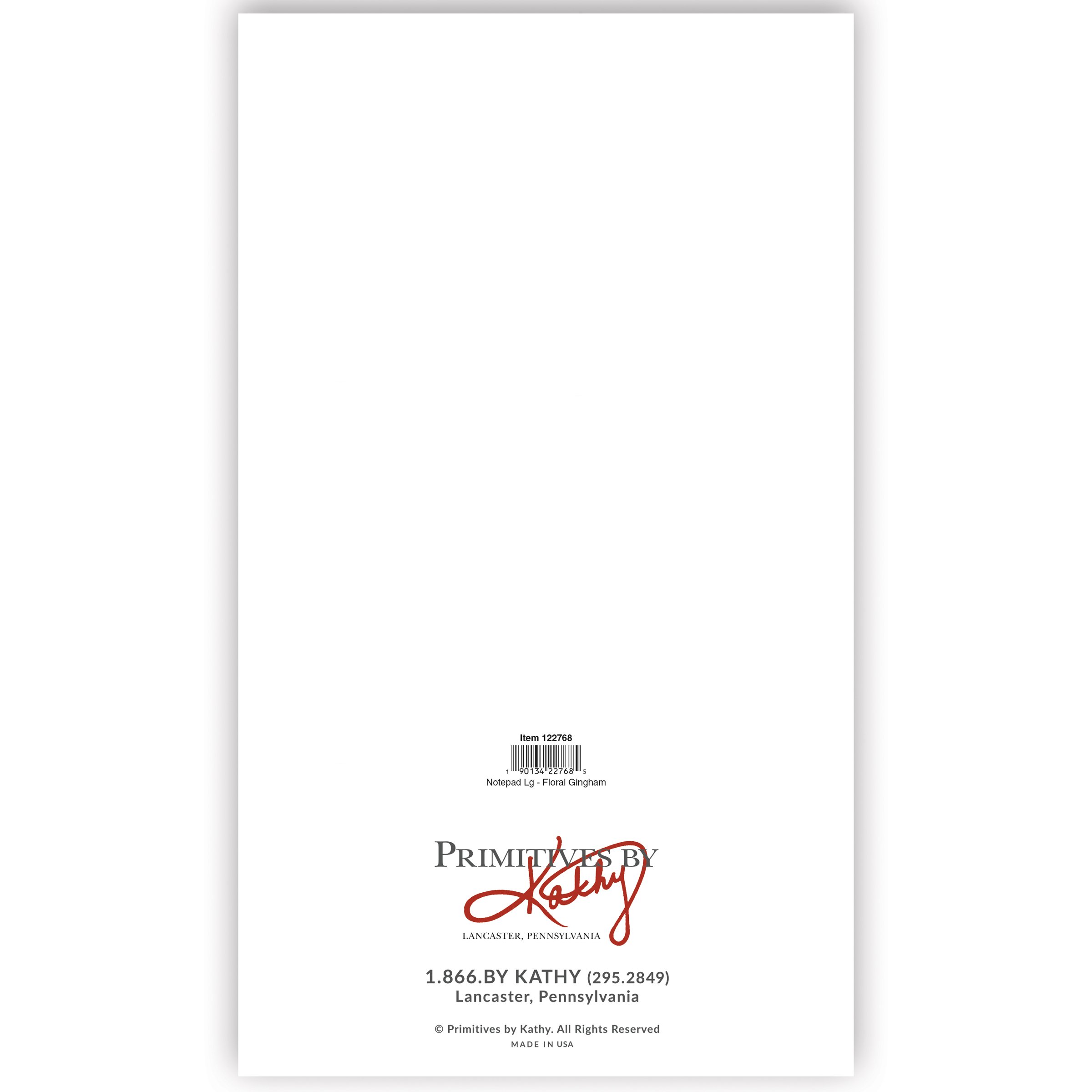 A large notepad from our Patriotic Collection featuring a folk art inspired design displaying a blue gingham pattern along the border of the writing space accented with florals in a soft patriotic color palette. Patriotic folk art design is replicated from original art hand painted in a unique watercolor style. Our large Floral Gingham notepad includes 60 pages and a strong magnet to easily hang on magnetic surface for display. Proudly made in the USA. A patriotic gift perfect for adding functional style to any space.
