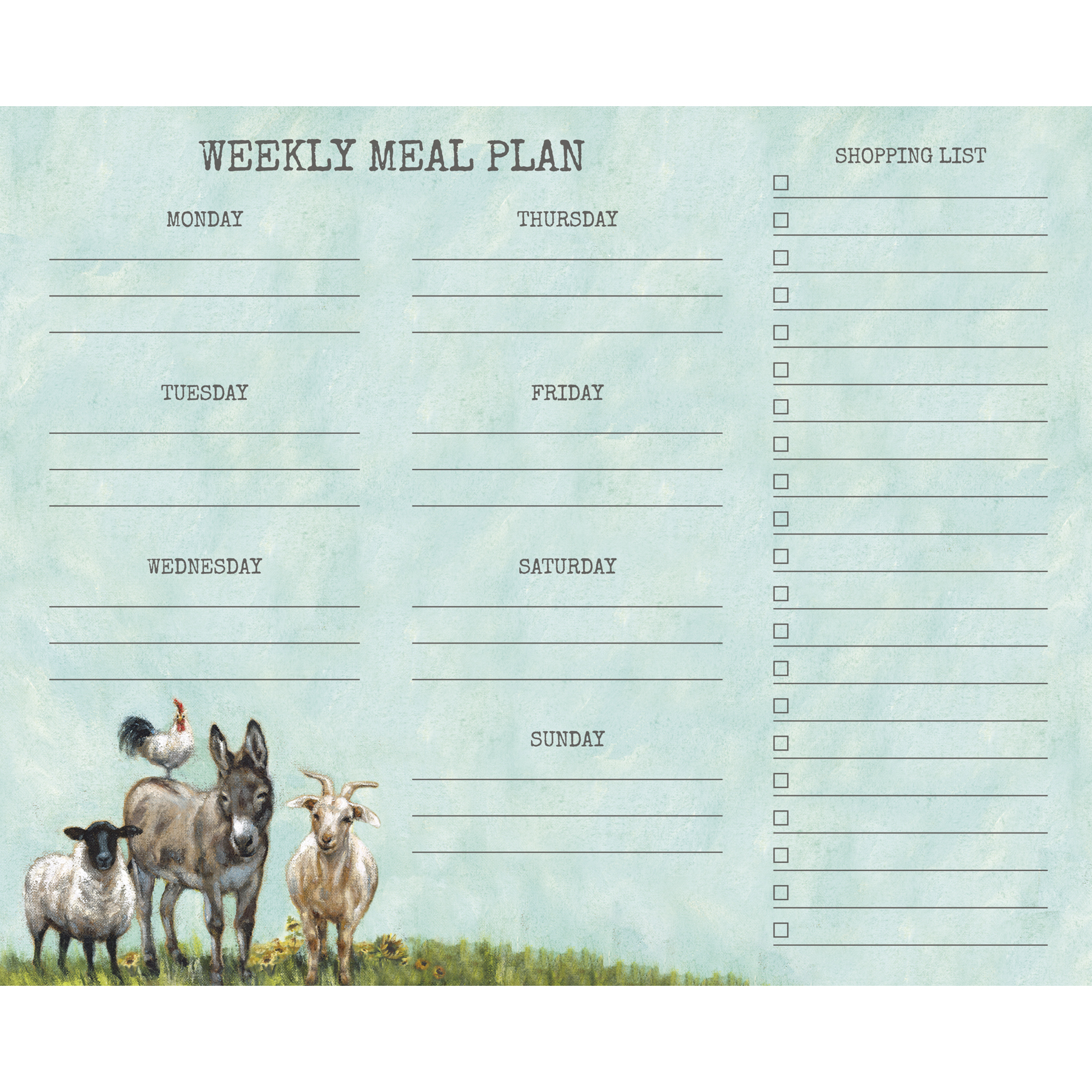 A notepad featuring farm animals in field. Design is replicated from original artwork painted onto burlap canvas, giving the art a unique depth and texture. Notepad features space for a shopping list and a weekly meal plan. Includes 60 pages. Made in the USA.