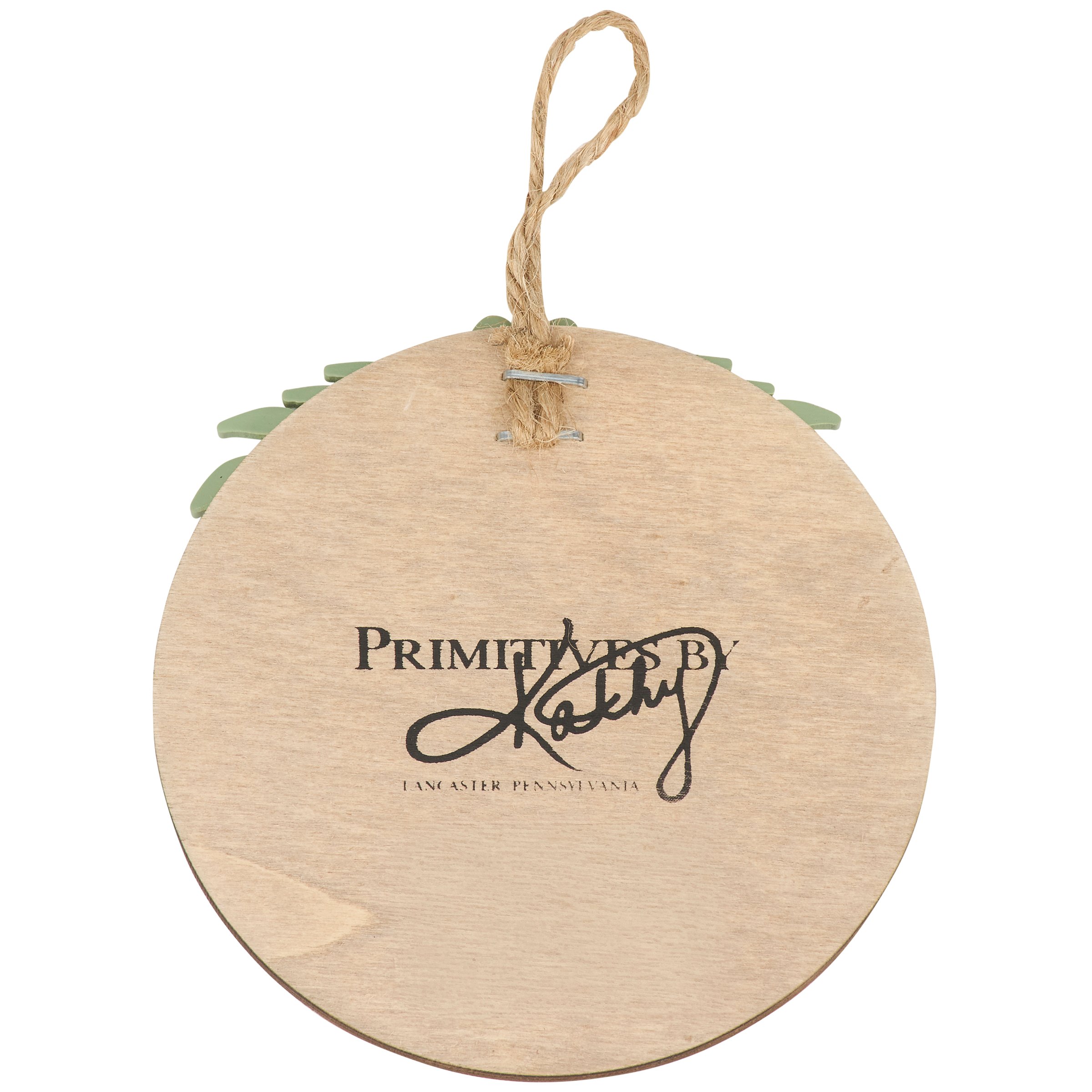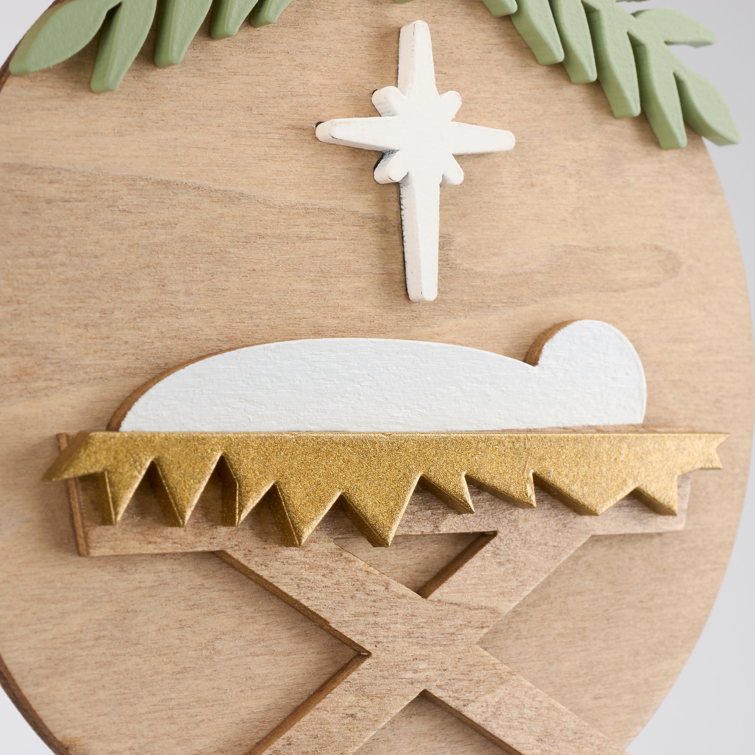 A wooden ornament from our Christmas Collection displaying a nativity inspired baby Jesus made with wooden cutouts for added dimension and metallic gold paint accents. Our Baby Jesus ornament is ready to hang for display via the attached twine hanger. A nativity themed Christmas home accent perfect for seasonal display.