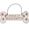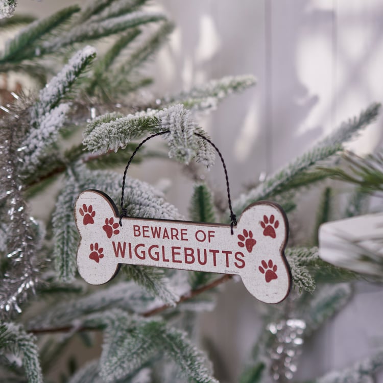 A wooden ornament from ourĀ Holiday Pet Collection/ featuring a dog bone cutout shape and pet inspired design in a rustic style. Design displays paw prints with a fun pet-themed sentiment that reads "Beware Of Wigglebutts." Pet ornament also features distressed details with coordinating black color on the sides and back. Our Beware Of Wigglebutts ornament is easy to hang for display via attached twisted wire hanger. A fun pet-themed ornament perfect for everyday display.