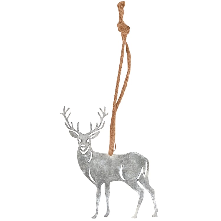 A metal ornament from our Christmas Collection in the shape of a buck with cutout details. Seasonal ornament features distressed details for added interest. Our Buck ornament is easy to hang for display via the included jute hanger. A rustic winter-themed ornament perfect for seasonal display.