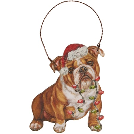 A wooden ornament from our Christmas Collection cut in the shape of the displayed holiday dog design featuring a charming bulldog wearing a Santa hat with Christmas lights in its mouth. Design is replicated from original artwork painted onto burlap canvas, giving the art a unique depth and texture. Seasonal ornament features distressed details with coordinating natural wood on the sides and back where it can be personalized with owner's pet name and details. Our Bulldog Lights ornament is easy to hang for display via attached twisted wire hanger. A fun holiday gift combining a love of Christmas and pets.
