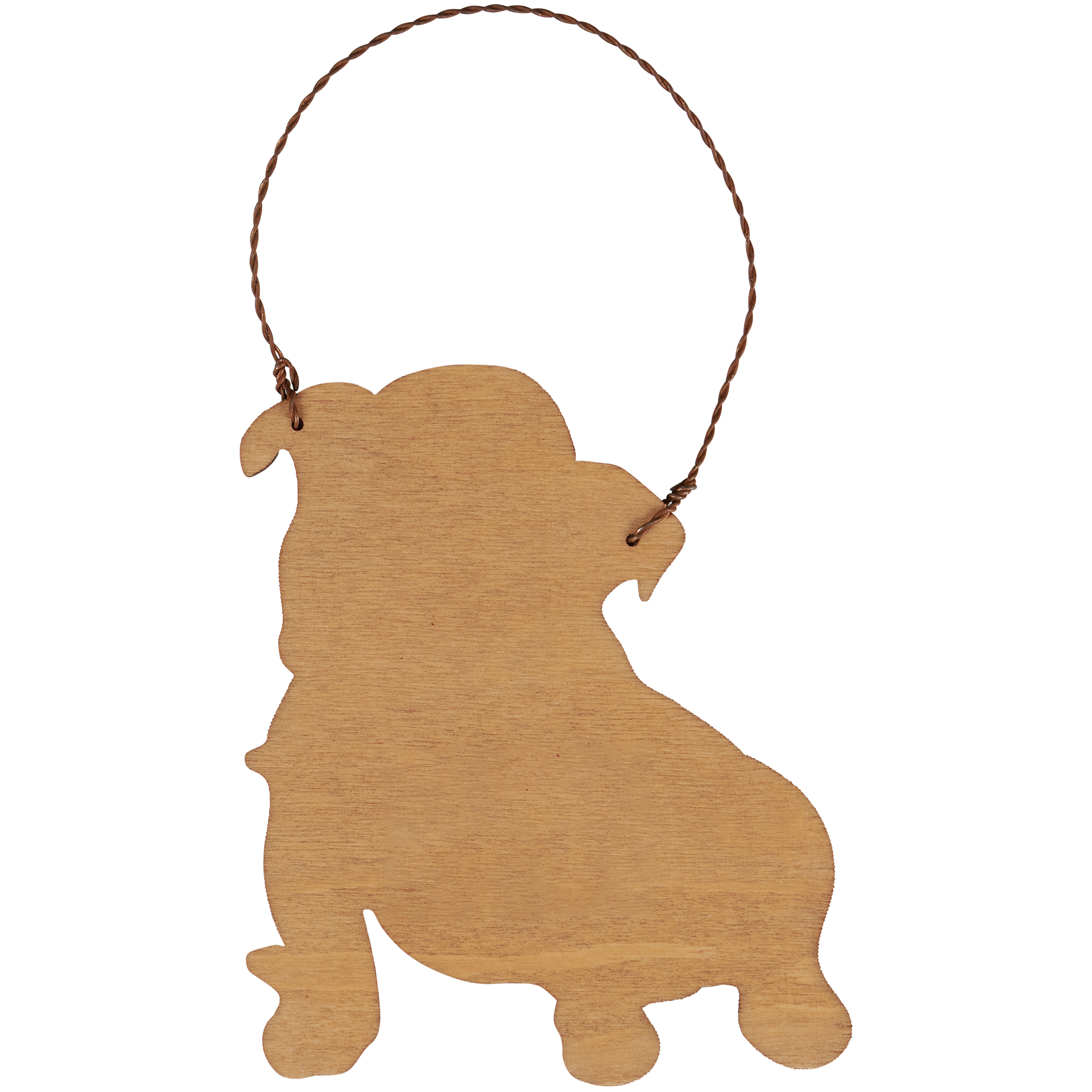 A wooden ornament from ourĀ Christmas Collection cut in the shape of the displayed holiday dog design featuring a charming bulldog wearing a Santa hat with Christmas lights in its mouth. Design is replicated from original artwork painted onto burlap canvas, giving the art a unique depth and texture. Seasonal ornament features distressed details with coordinating natural wood on the sides and back where it can be personalized with owner's pet name and details. Our Bulldog Lights ornament is easy to hang for display via attached twisted wire hanger. A fun holiday gift combining a love of Christmas and pets.