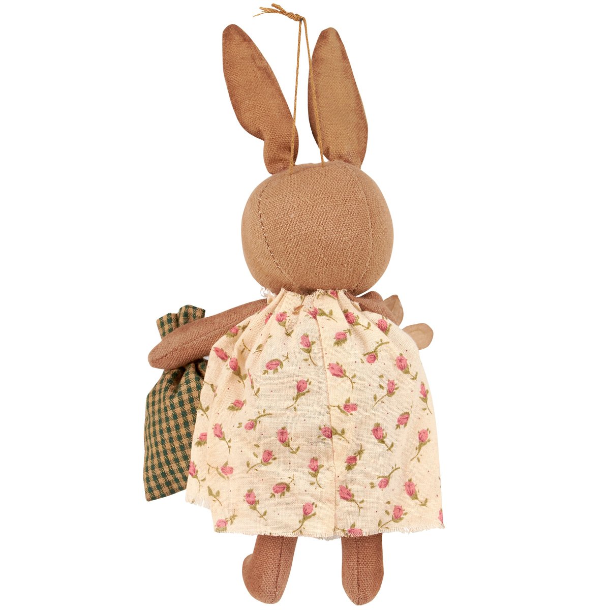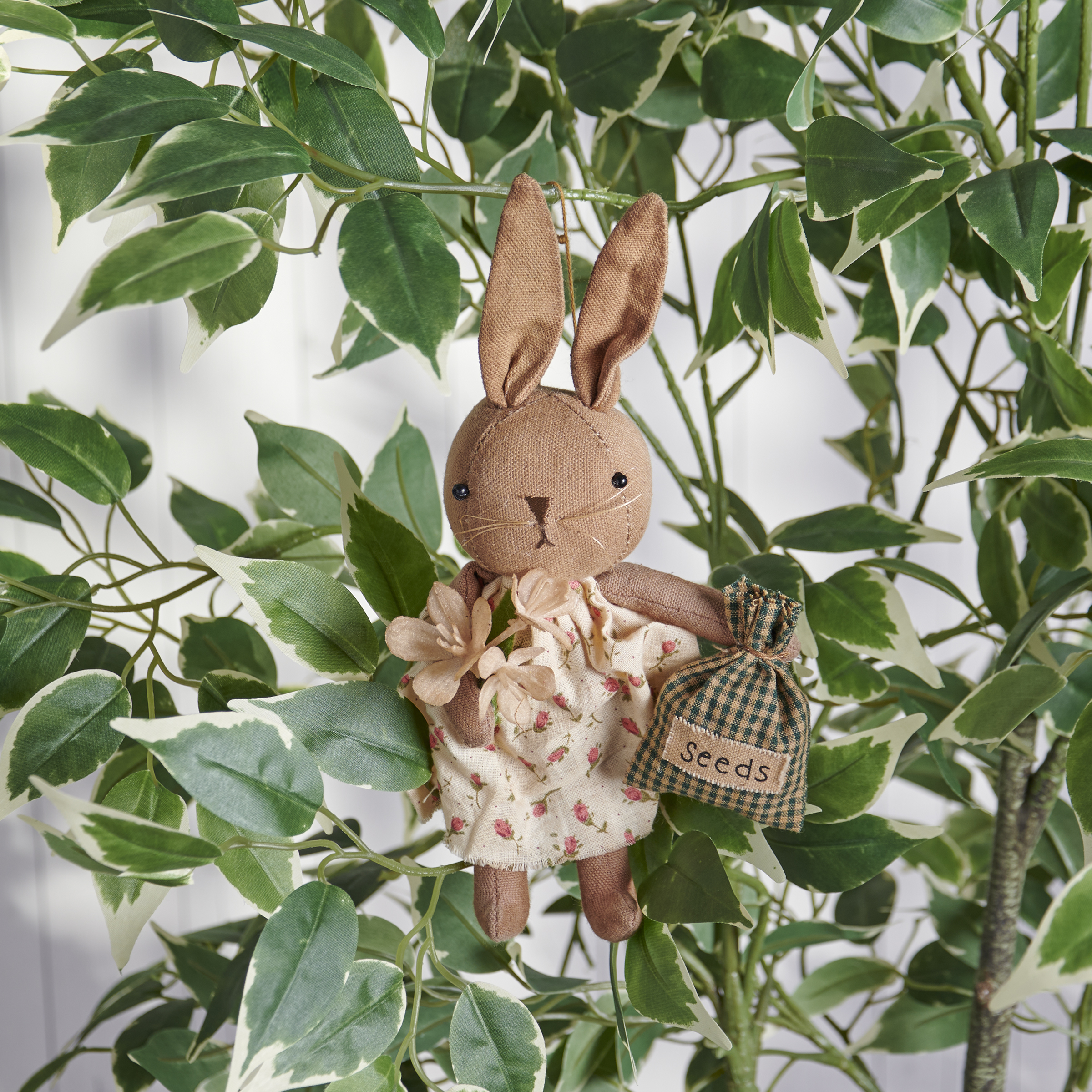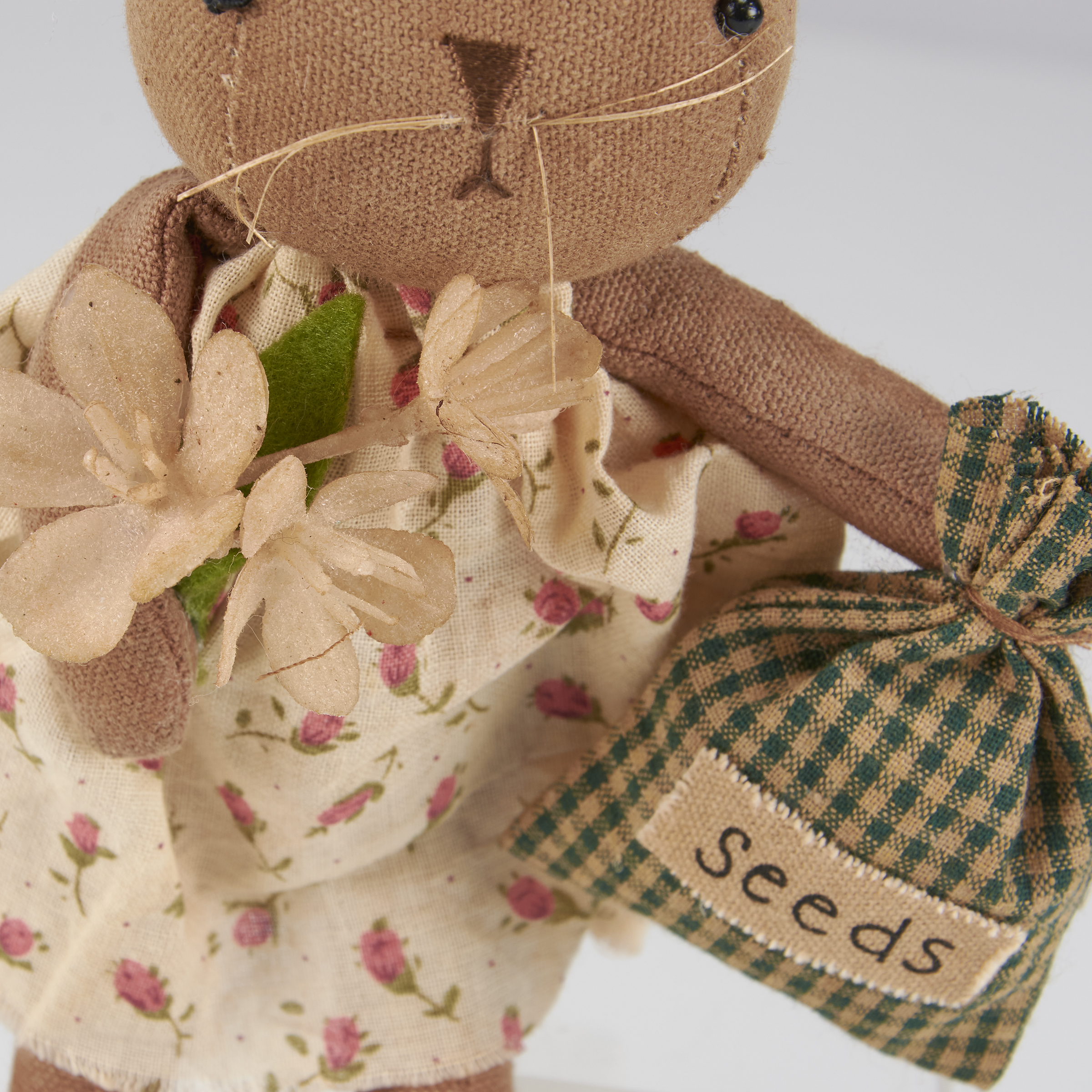 A decorative ornament from our Easter & Spring Collection featuring a primitive inspired bunny doll with floral dress holding flowers and bag of seeds. Our Bunny Seeds ornament is easy to hang via attached string hanger. A primitive seasonal home accent with a variety of display options.