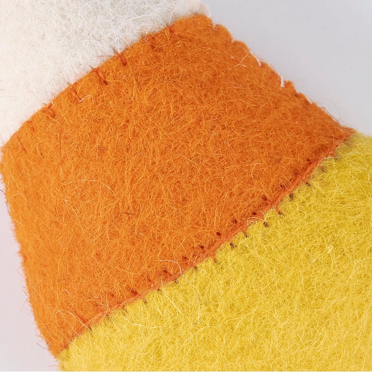 A felt ornament from our Halloween Collection displaying a stuffed candy corn design. Ornament features colored felt pieces stitched together to create candy corn appearance. Our Candy Corn ornament is easy to hang via attached loop or can be added to table setting. A fun seasonal home accent with a variety of display options.