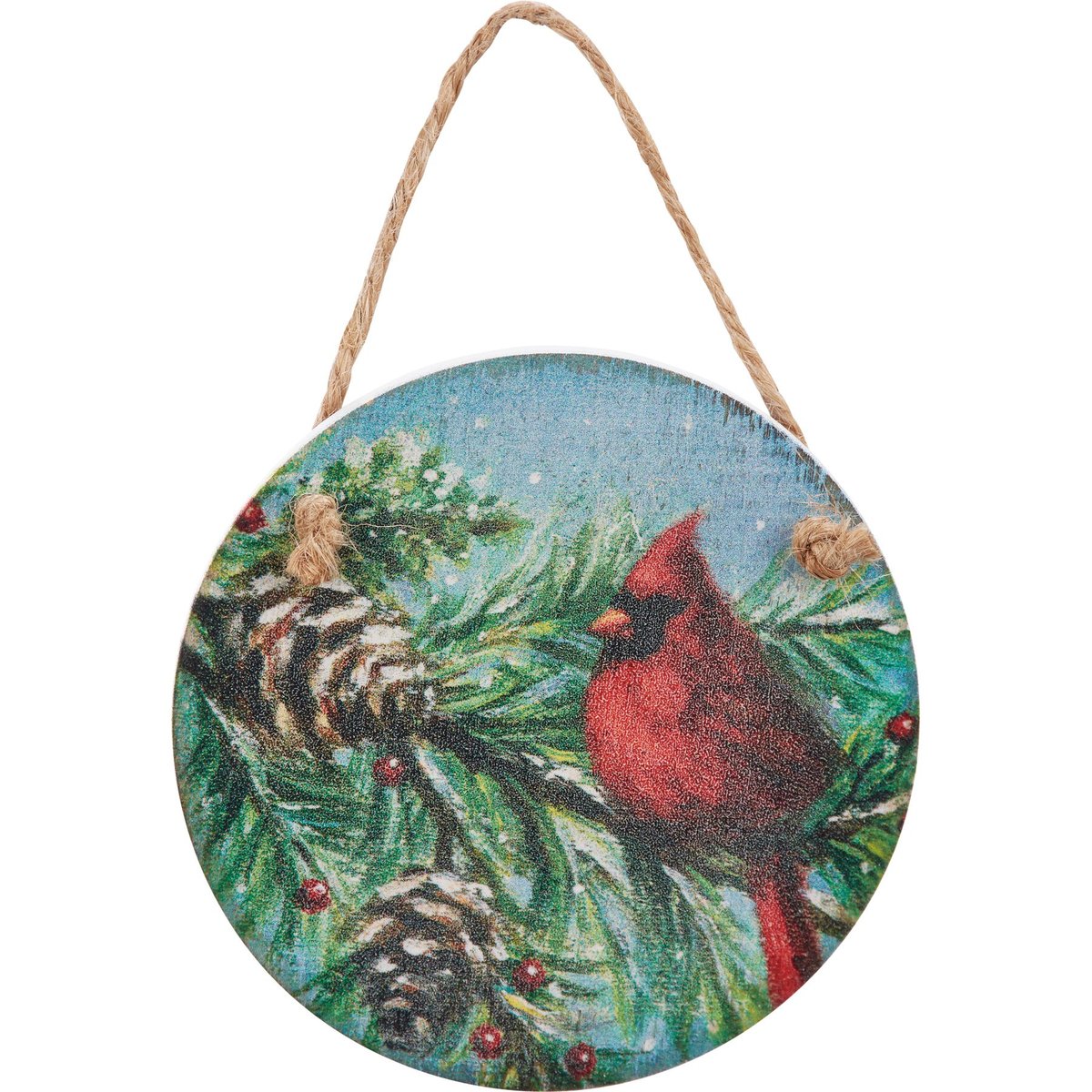 A wooden ornament from our Christmas Collection displaying a hand painted design of a cardinal in a snowy woodland. Design is replicated from original artwork painted onto burlap canvas, giving the art a unique depth and texture. Our woodland cardinal ornament includes complementing jute hanger.