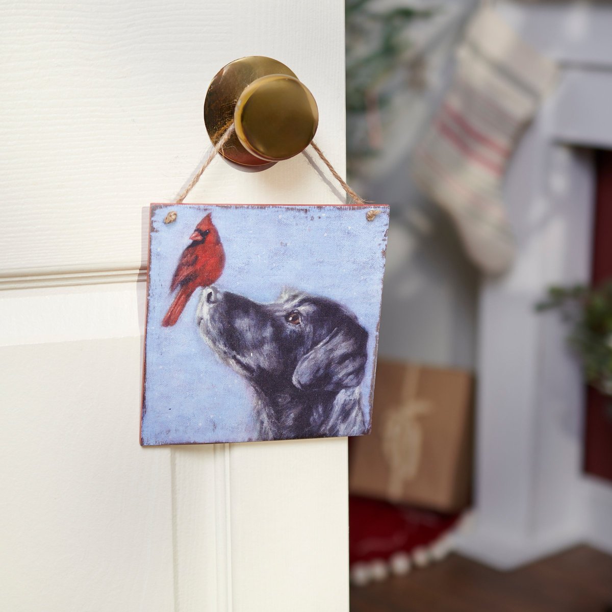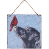 A wooden ornament from our Christmas Collection displaying a charming winter scene of a cardinal and a black labrador. Design is replicated from original artwork painted onto burlap canvas, giving the art a unique depth and texture. Seasonal ornament features distressed details with coordinating red color on the sides and back. Our Cardinal And Lab ornament is easy to hang for display via attached jute hanger. A rustic winter-themed ornament perfect for seasonal display.