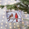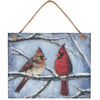 A wooden ornament from our Christmas Collection displaying a charming winter scene of a male and female cardinal. Design is replicated from original artwork painted onto burlap canvas, giving the art a unique depth and texture. Seasonal ornament features distressed details with coordinating red color on the sides and back. Our Cardinal Couple ornament is easy to hang for display via attached jute hanger. A rustic winter-themed ornament perfect for seasonal display.