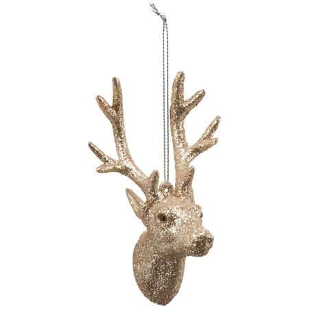 A deer head ornament from our Christmas Collection featuring champagne glitter with top loop for easy hanging. Our Glitter Deer ornament pairs perfectly with other vintage Christmas decor for a charming holiday display.