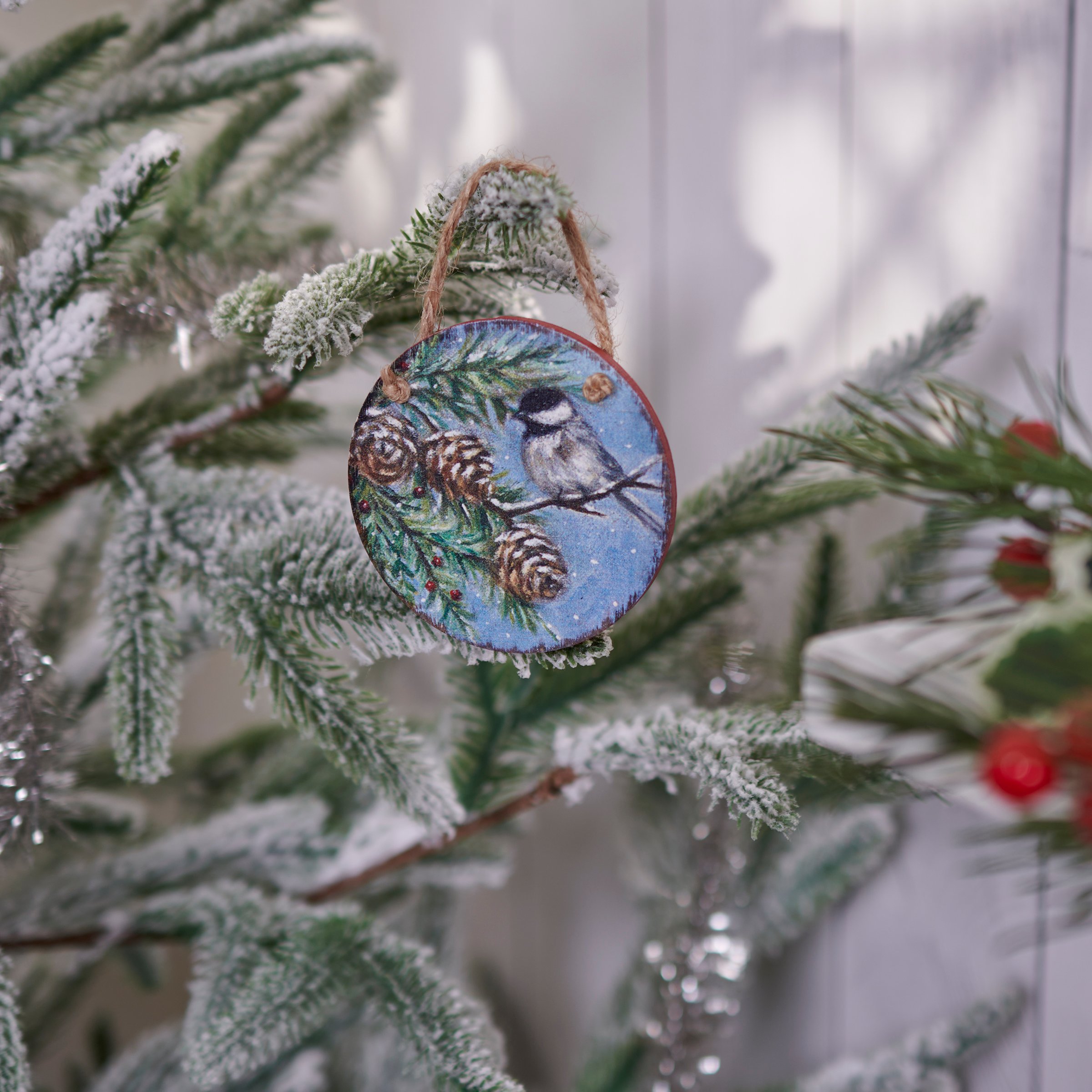 A round wooden ornament from our Christmas Collection displaying a charming winter scene of a chickadee. Design is replicated from original artwork painted onto burlap canvas, giving the art a unique depth and texture. Seasonal ornament features distressed details with coordinating red color on the sides and back. Our Chickadee ornament is easy to hang for display via attached jute hanger. A rustic winter-themed ornament perfect for seasonal display.