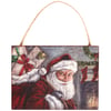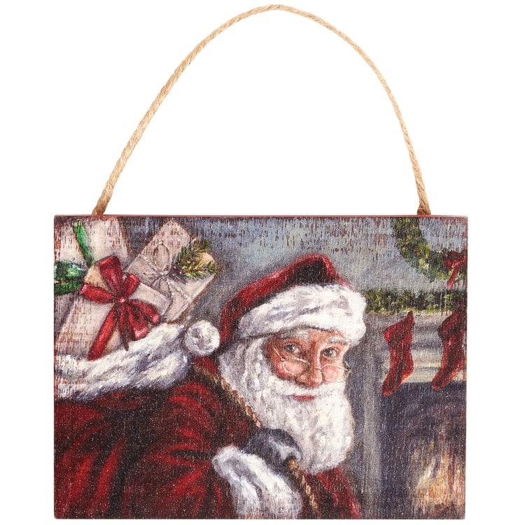A wooden ornament from our Christmas Collection displaying a charming scene of Santa delivering presents on Christmas eve. Santa design is replicated from original artwork painted onto burlap canvas, giving the art a unique depth and texture. Seasonal ornament features distressed details with coordinating red color on the sides and back. Our Christmas Eve Santa ornament is easy to hang for display via attached jute hanger. A rustic Christmas home accent perfect for seasonal display.