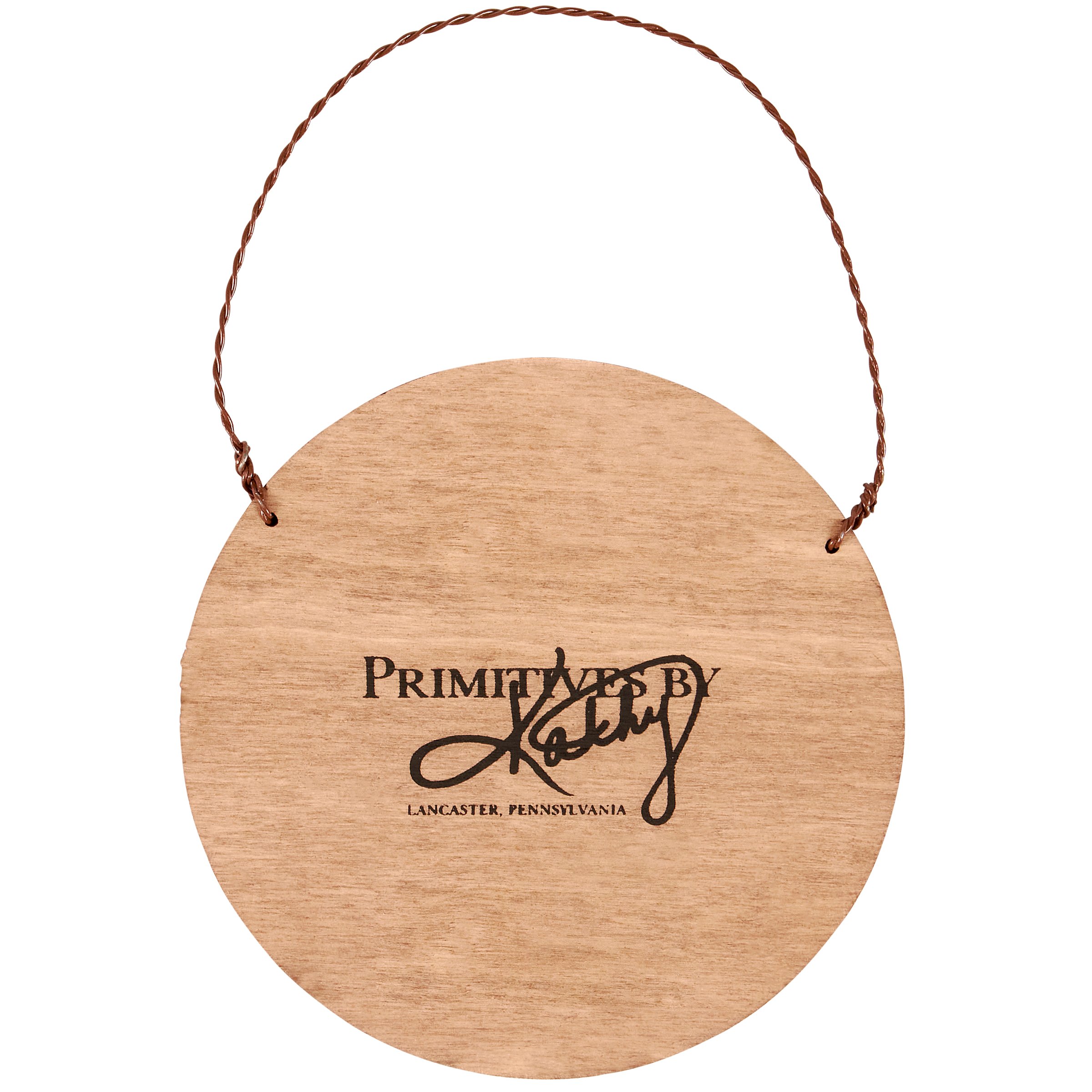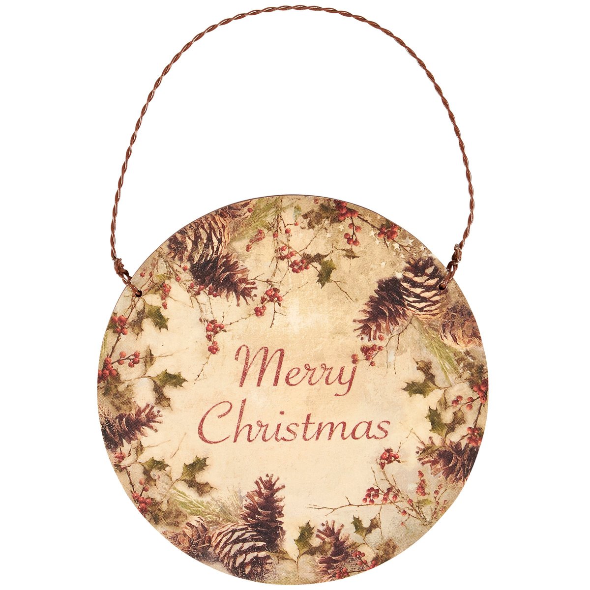A round wooden ornament from our Christmas Collection displaying vintage art of holly and pinecones around a seasonal sentiment that reads "Merry Christmas." Seasonal ornament features coordinating natural wood on the sides and back. Our Christmas Holly ornament is easy to hang for display via attached twisted wire hanger. A vintage Christmas home accent perfect for seasonal display.