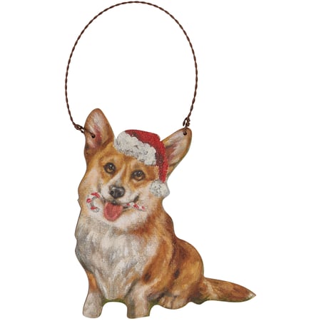 A wooden ornament from our Christmas Collection cut in the shape of the displayed holiday dog design featuring a charming corgi wearing a Santa hat with a candy cane in its mouth. Design is replicated from original artwork painted onto burlap canvas, giving the art a unique depth and texture. Seasonal ornament features distressed details with coordinating natural wood on the sides and back where it can be personalized with owner's pet name and details. Our Corgi Candy Cane ornament is easy to hang for display via attached twisted wire hanger. A fun holiday gift combining a love of Christmas and pets.
