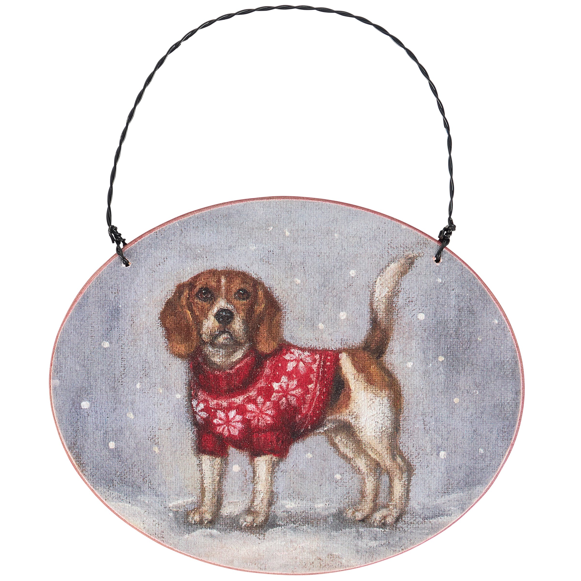 A wooden ornament from our Christmas Collection displaying a holiday dog design featuring a charming beagle wearing a cozy Christmas sweater in snowy weather. Holiday dog design is replicated from original artwork painted onto burlap canvas, giving the art a unique depth and texture. Seasonal ornament features distressed details with coordinating red color on the sides and back where it can be personalized with owner's pet name and holiday memories. Our Cozy Beagle ornament is easy to hang for display via attached twisted wire hanger. A rustic holiday gift combining a love of Christmas and pets.