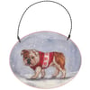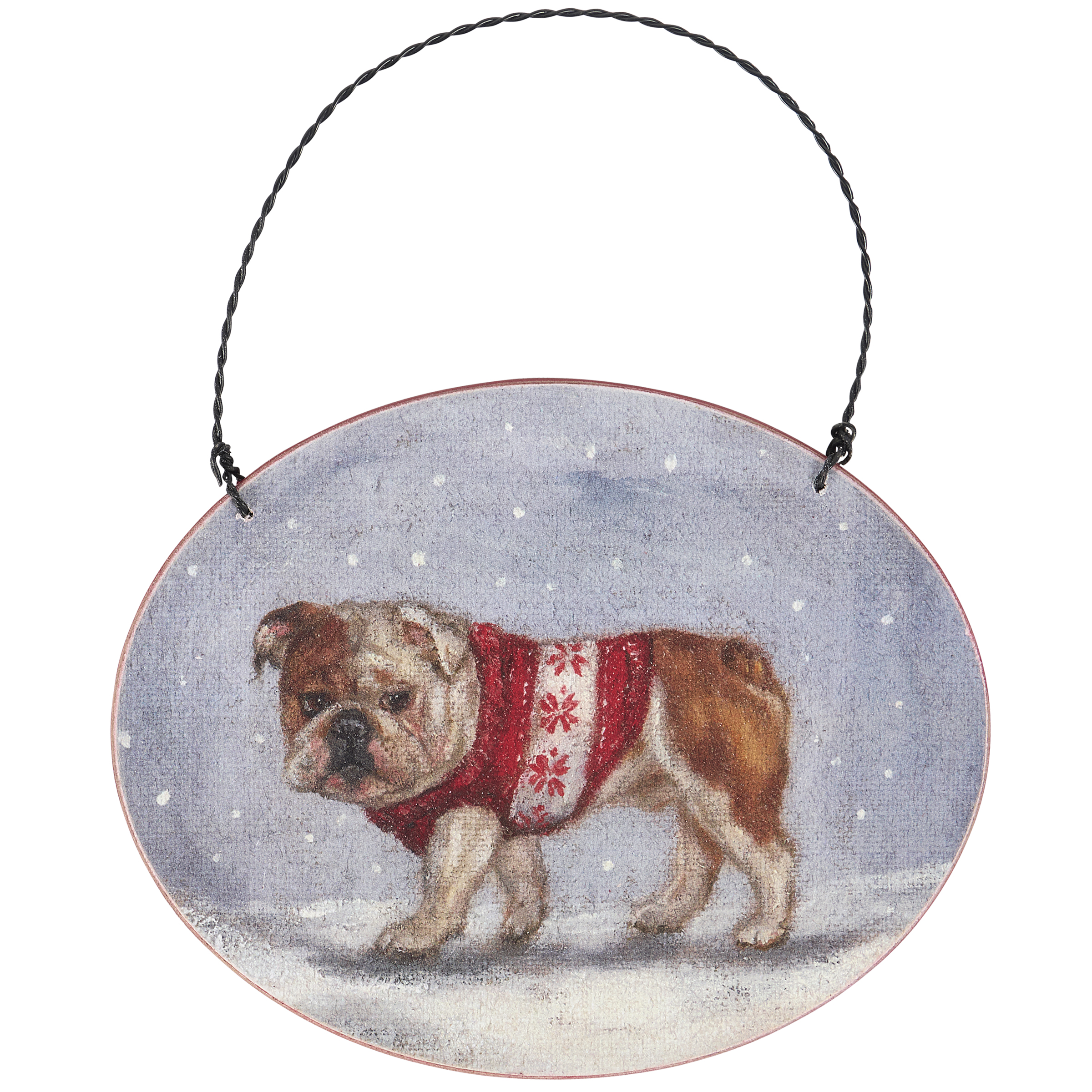 A wooden ornament from our Christmas Collection displaying a holiday dog design featuring a charming bulldog wearing a cozy Christmas sweater in snowy weather. Holiday dog design is replicated from original artwork painted onto burlap canvas, giving the art a unique depth and texture. Seasonal ornament features distressed details with coordinating red color on the sides and back where it can be personalized with owner's pet name and holiday memories. Our Cozy Bulldog ornament is easy to hang for display via attached twisted wire hanger. A rustic holiday gift combining a love of Christmas and pets.