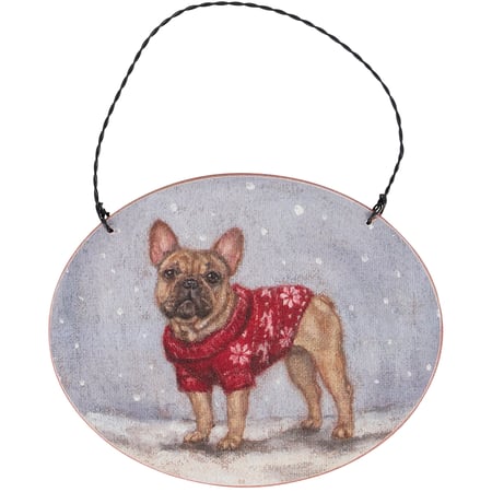 A wooden ornament from our Christmas Collection displaying a holiday dog design featuring a charming French bulldog wearing a cozy Christmas sweater in snowy weather. Holiday dog design is replicated from original artwork painted onto burlap canvas, giving the art a unique depth and texture. Seasonal ornament features distressed details with coordinating red color on the sides and back where it can be personalized with owner's pet name and holiday memories. Our Cozy French Bulldog ornament is easy to hang for display via attached twisted wire hanger. A rustic holiday gift combining a love of Christmas and pets.