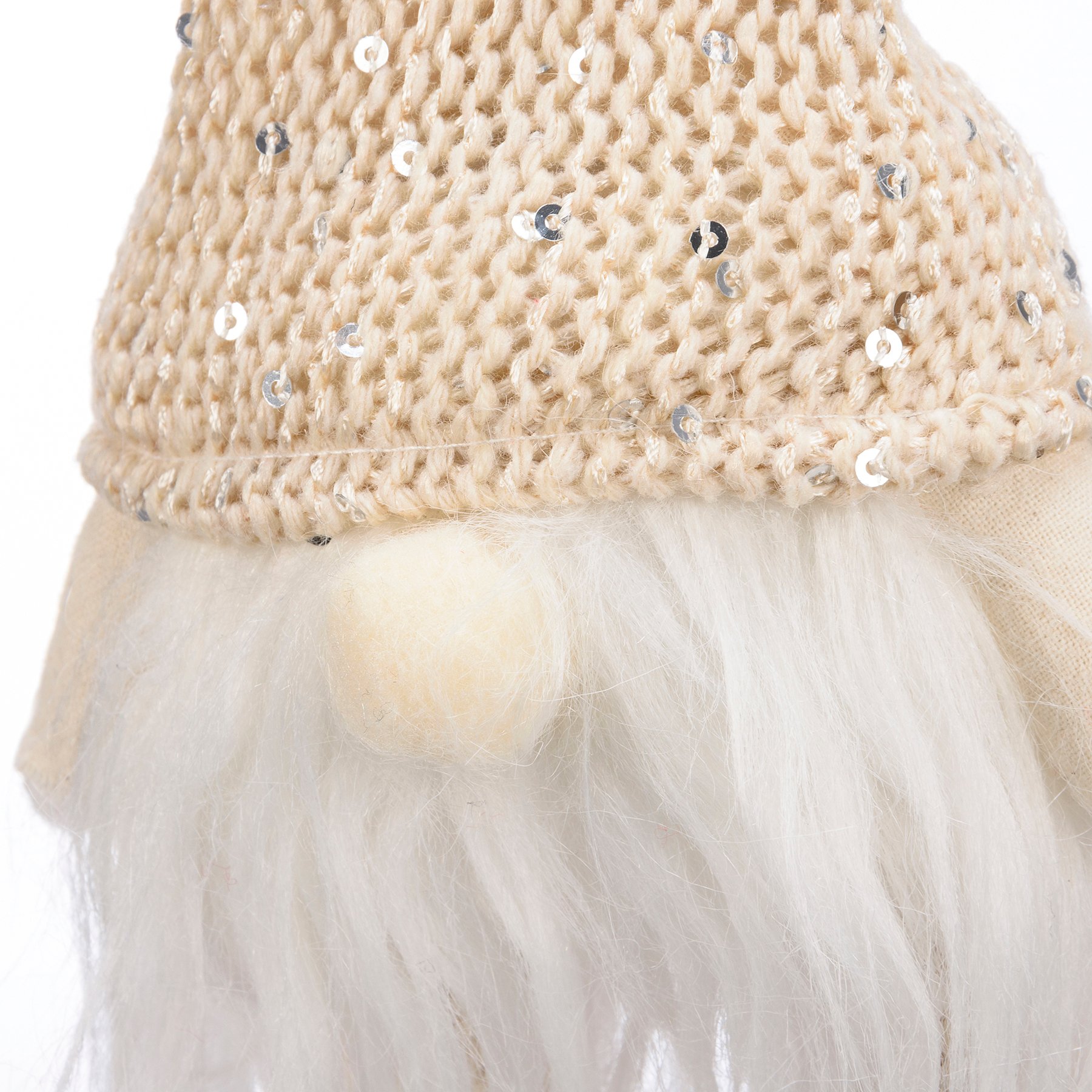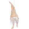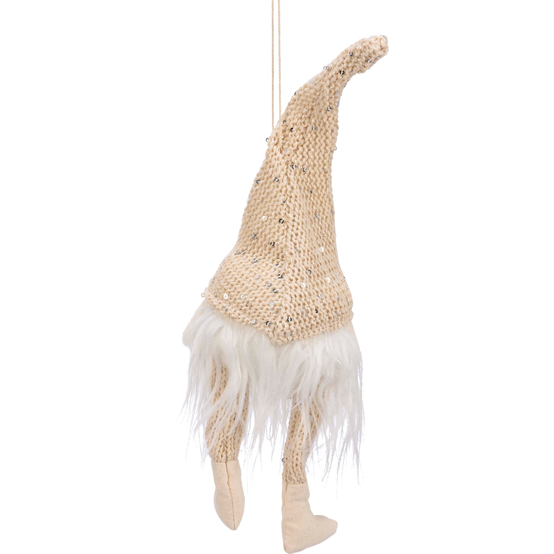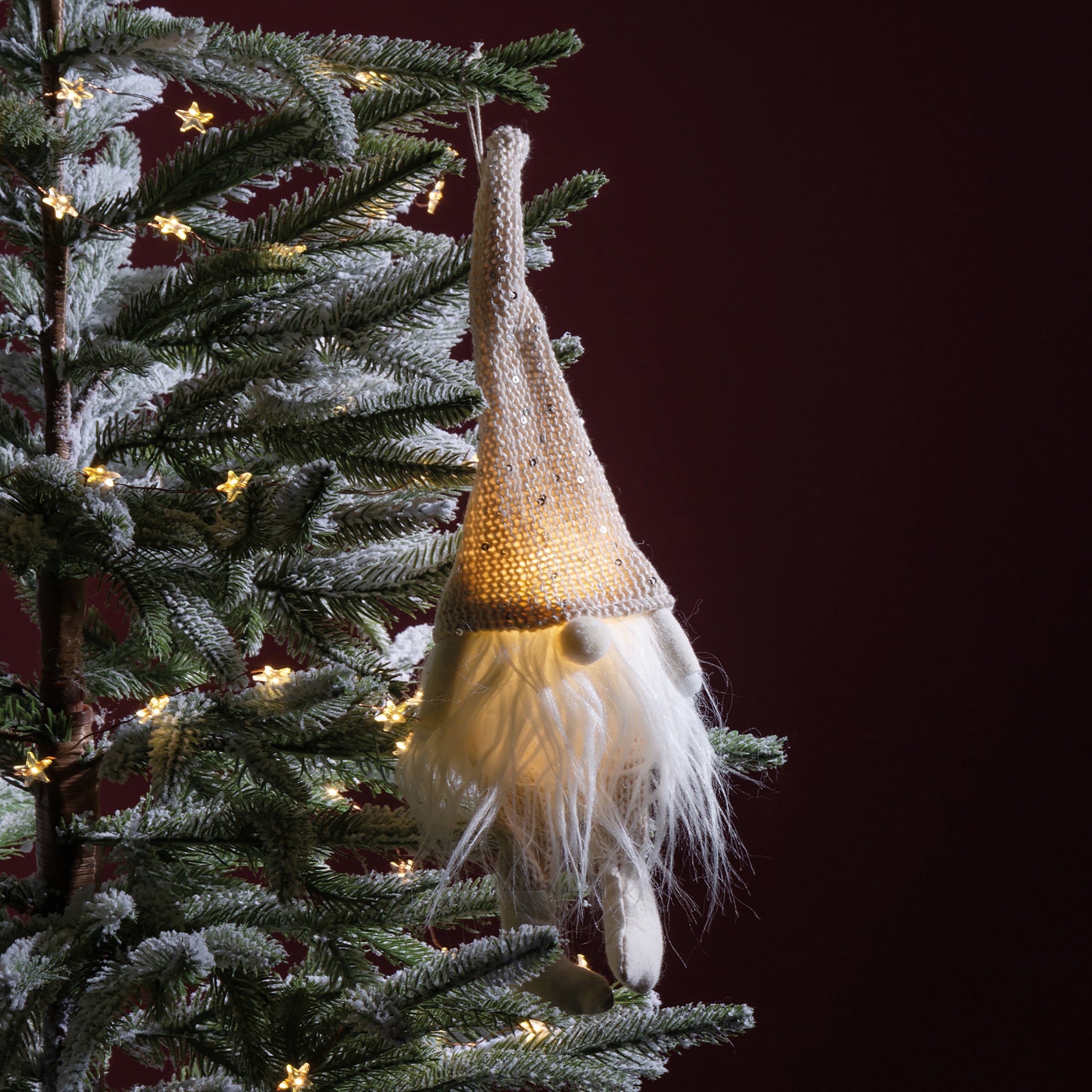 A fabric gnome Christmas ornament featuring a lighted plastic body with a pom pom nose, dangling knit legs, and a sequin-studded knit hat for added interest. Requires three 1.5V batteries (included). Easily hangs by attached cotton string. Pairs well with other gnome ornaments and Christmas plaids.