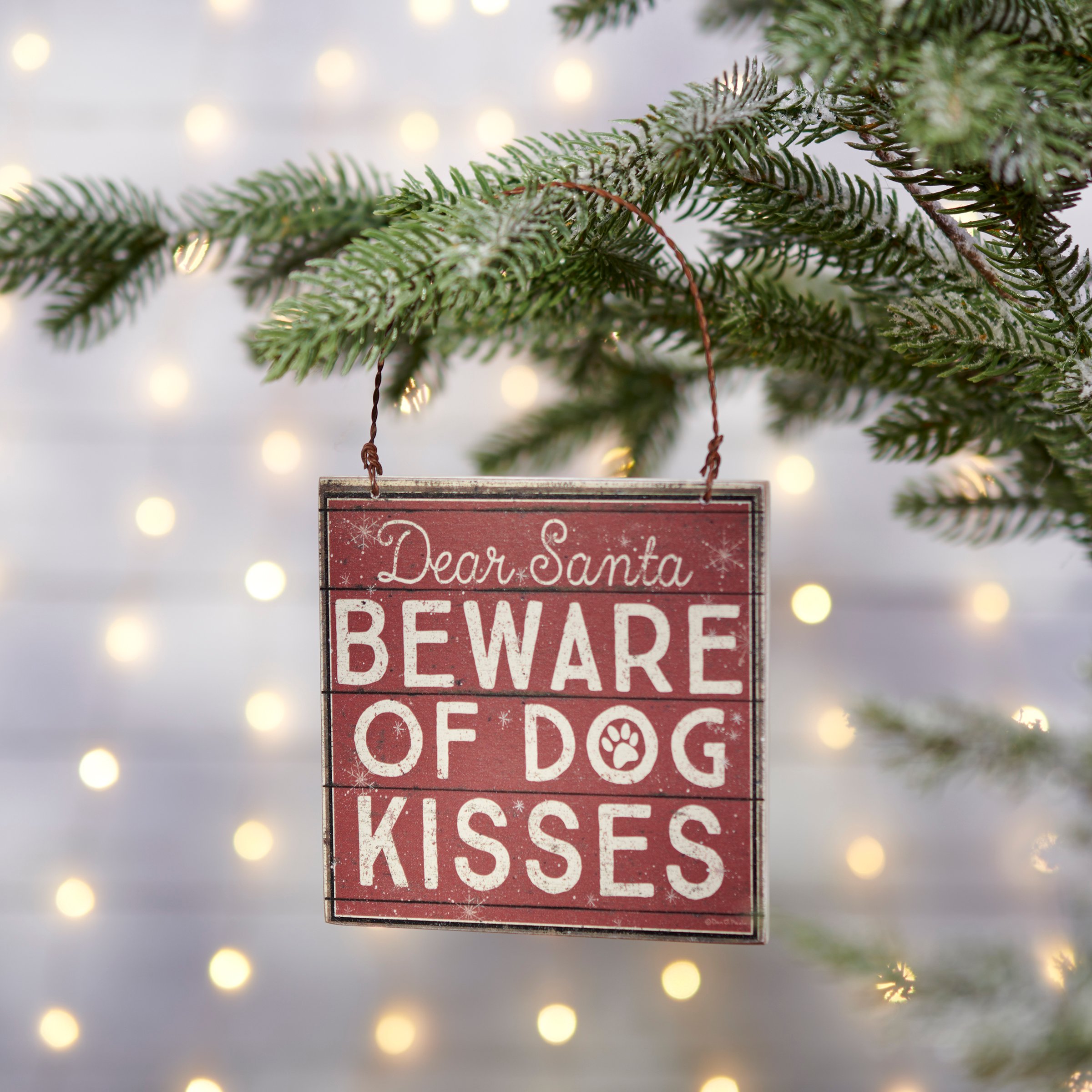 A wooden ornament from our Holiday Pet Collection/ featuring a pet inspired holiday design in a rustic style. Design displays a fun pet-themed sentiment that reads "Dear Santa Beware Of Dog Kisses." Seasonal ornament also features distressed details with coordinating white color on the sides and back. Our Dog Kisses ornament is easy to hang for display via attached twisted wire hanger. A fun pet-themed ornament perfect for seasonal display.
