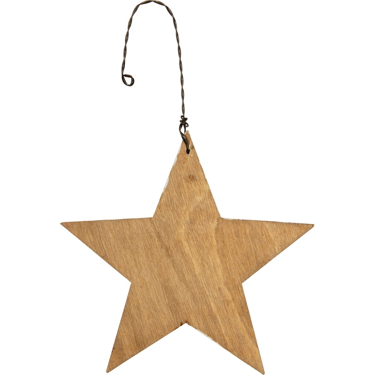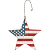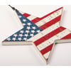 A wooden star-shaped ornament featuring a rustic American flag design with debossed star details. Easily hangs by twisted wire hook.