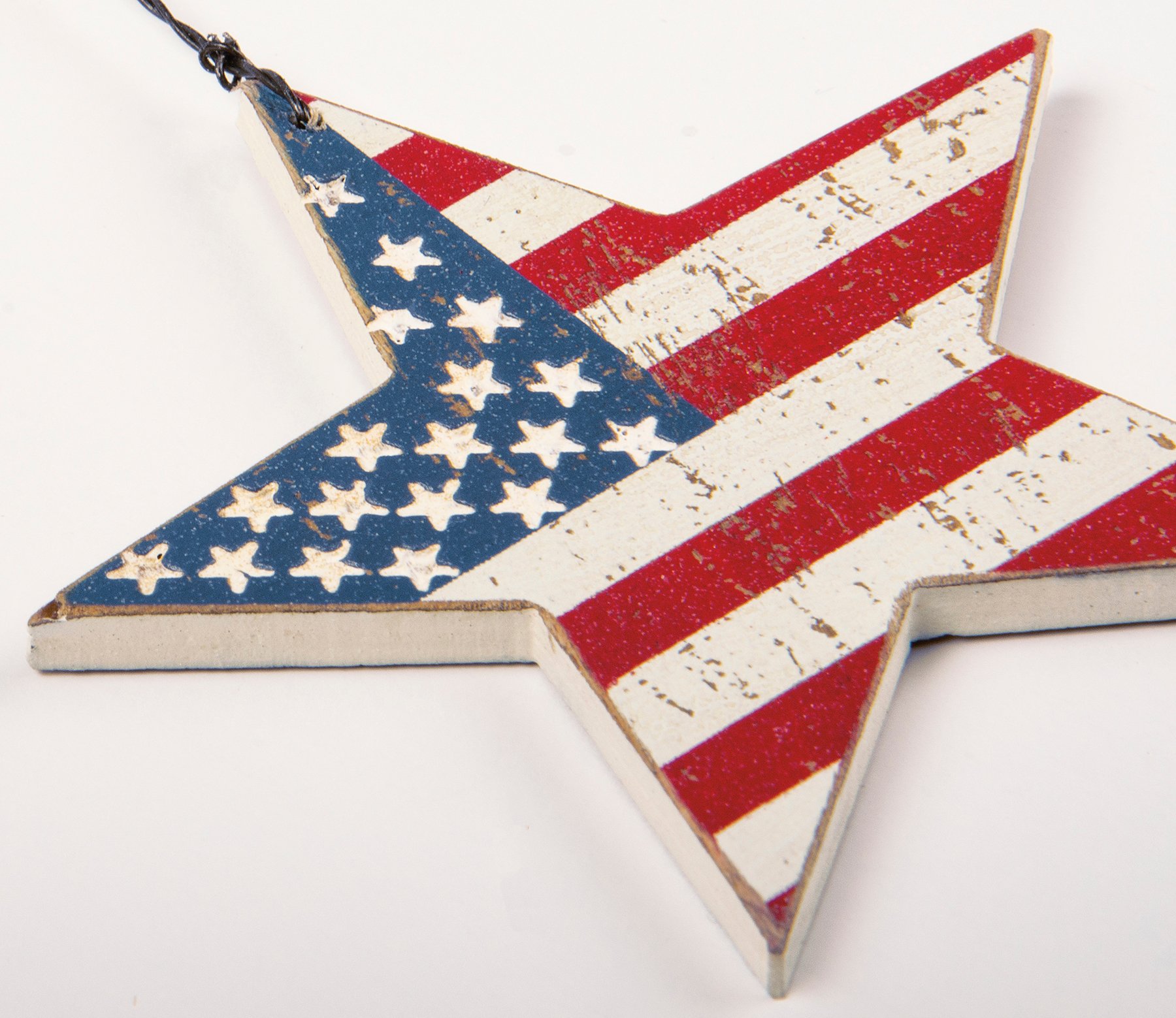 A wooden star-shaped ornament featuring a rustic American flag design with debossed star details. Easily hangs by twisted wire hook.