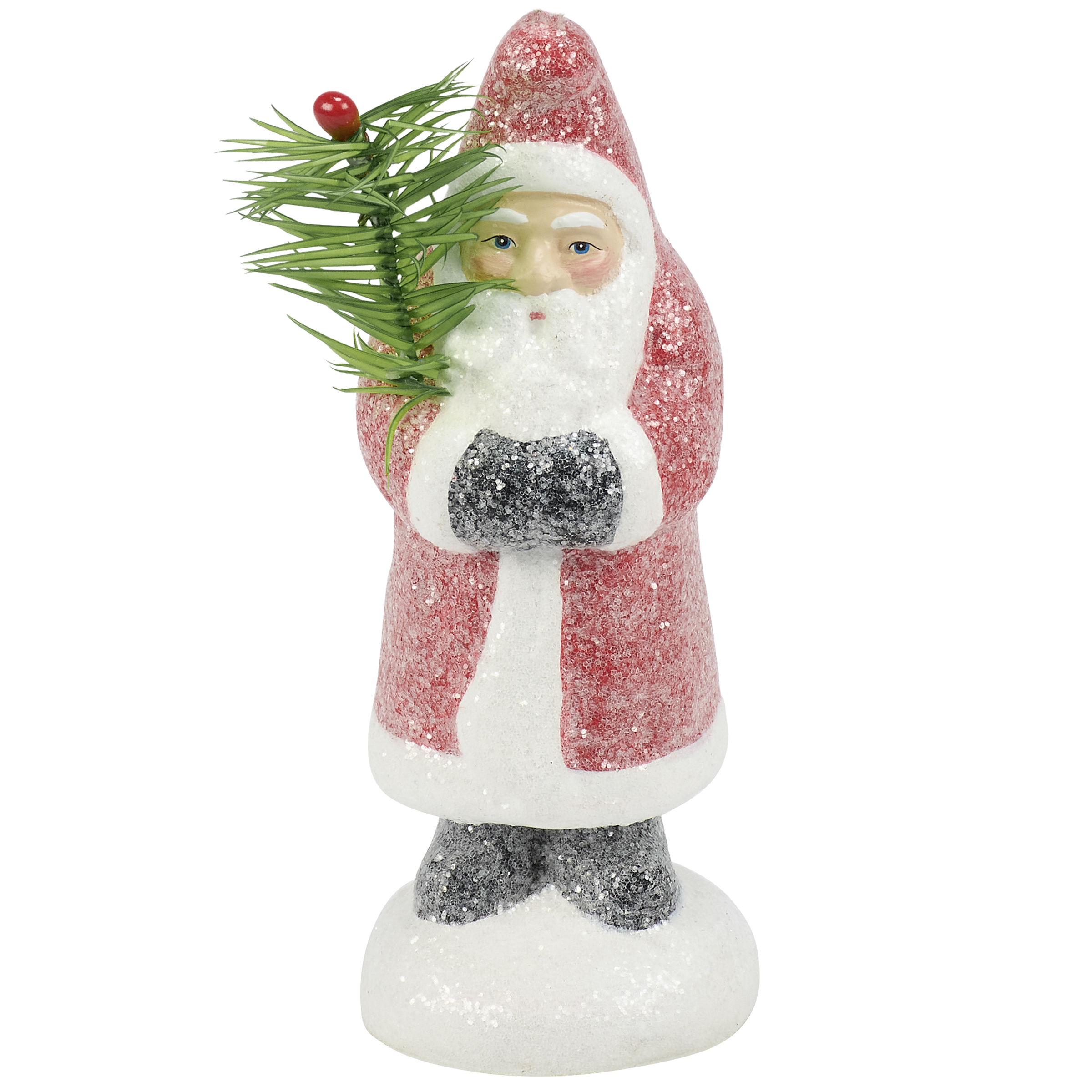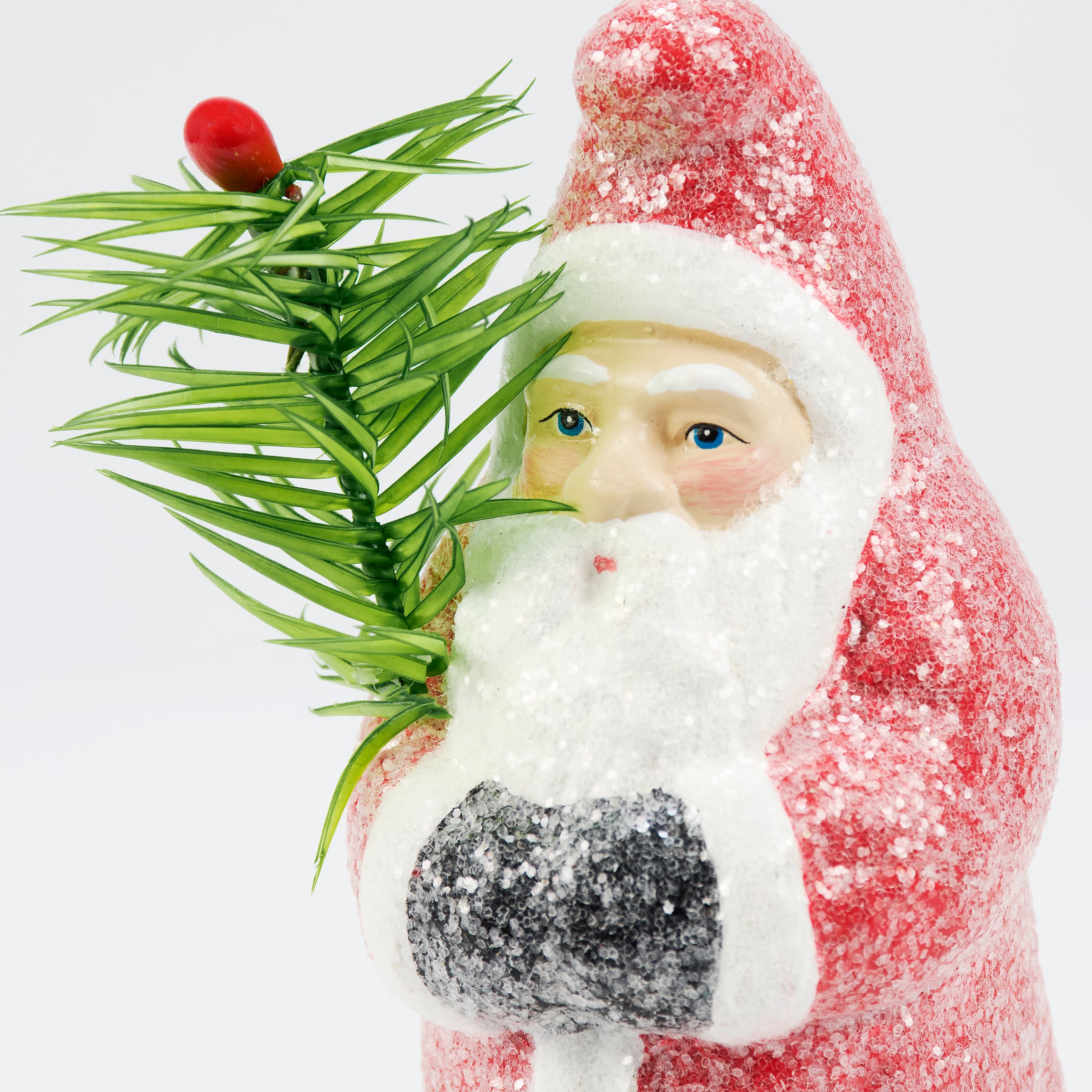A decorative figurine from our Christmas Collection displaying a vintage Santa design with painted details throughout and a mica coating for a frosty finish. Santa figurine features unique details including faux holly in his hand. Our Frosty Santa figurine is designed to free stand on flat surface for easy display. A vintage Christmas home accent with a variety of seasonal display options.